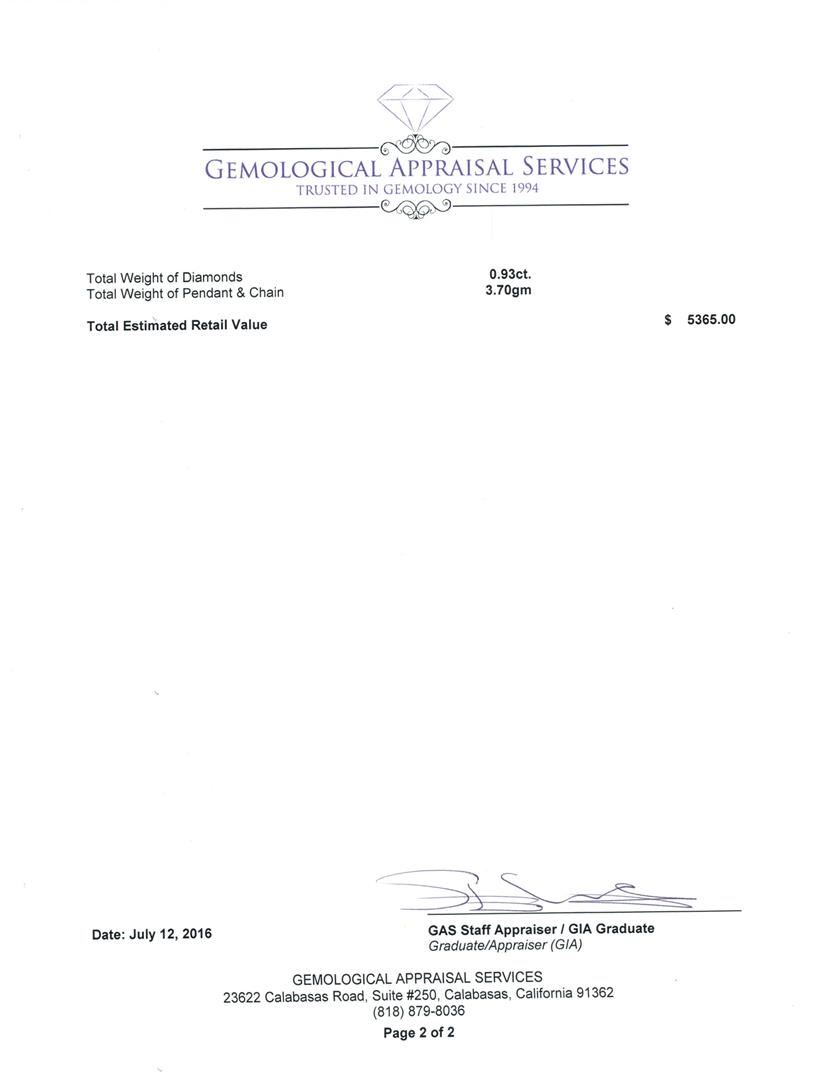 One electronically tested 14KT white gold lady's combination cast & assembled dangle pendant & chain 18.0' long, 1.3mm round cable link with a lobster claw clasp with a bright polish with milgrain detailing finish. Identified with markings of '14K'. Condition is new, good workmanship. Containing: One prong set round brilliant cut diamond, measuring 5.12 - 5.10 x 3.25mm (depth est.) , 5.00.%. GTCF approximate weight of 0.55ct. Graded in the setting. Clarity SI-3. Color: H Cut Good One prong set round brilliant cut diamond, measuring 3.73 - 3.68 x 2.15mm (depth est.) approximate weight of 0.17ct. Graded in the setting. Clarity SI-2. Color: H Cut Good One prong set round brilliant cut diamond, measuring 2.97 - 2.94 x 1.78mm (depth est.) approximate weight of 0.10ct. Graded in the setting. Clarity SI-2. Color: G Cut Good Seventeen prong set round brilliant cut diamonds, measuring 1.25 - 1.15 x 0.73mm (depth est.) approximate total weight of 17 Stones = 0.11ct. Graded in the setting. Clarity SI-1 to SI-2. Color: G - H Cut Good. Total Weight of Diamonds 0.93ct.. Total Weight of Pendant & Chain 3.70gm. GAS Appraised at $5,365.00.