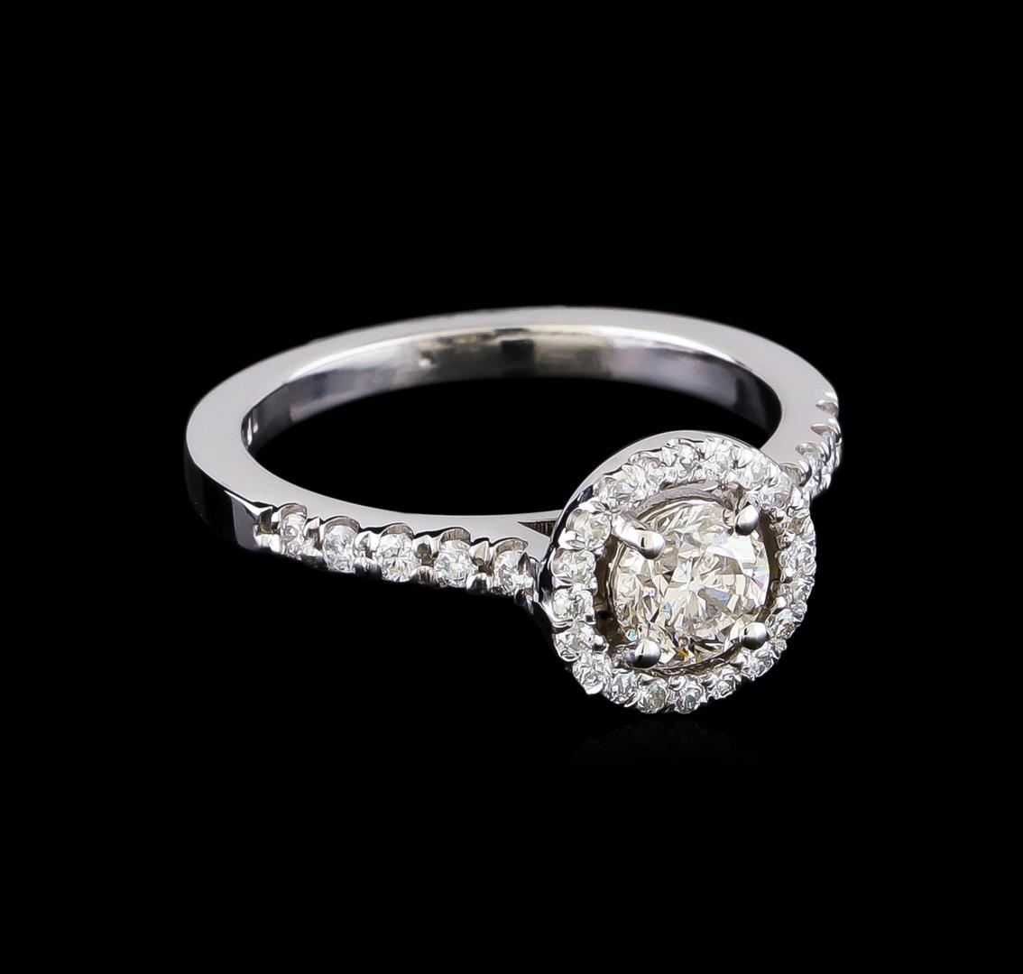 One electronically tested 14KT white gold lady's cast wedding ring with a halo with a bright polish finish. The featured lady's ring has a shank measuring 1.97 millimeters in width. Identified with markings of "14K". Condition is new, good workmanship. Containing: One prong set round brilliant cut diamond, measuring 5.17 - 5.10 x 3.65mm (depth est.) , 5.00.%. GTCF approximate weight of 0.63ct. Graded in the setting. Clarity: I-1. Color: I - Very Good Ten prong set round brilliant cut diamonds, measuring 1.65 - 1.55 x 0.99mm (depth est.) approximate total weight of 10 Stones = 0.15ct. Graded in the setting. Clarity: SI-1 to SI-2. Color: H - I. Cut Good Twenty prong set round brilliant cut diamonds, measuring 1.30 - 1.20 x 0.75mm (depth est.) approximate total weight of 20 Stones = 0.15ct. Graded in the setting. Clarity: SI-1 to I-1. Color: H - I. Cut Good. Total Weight of Diamonds 0.93ct. Total Weight of Ring 3.30gm GAS Appraised at $4,560.00.