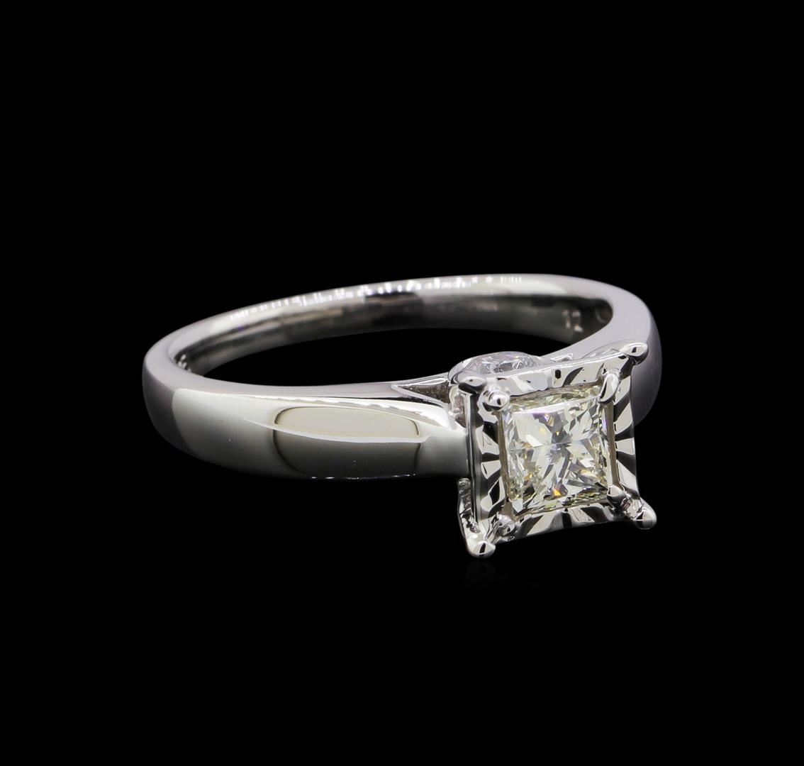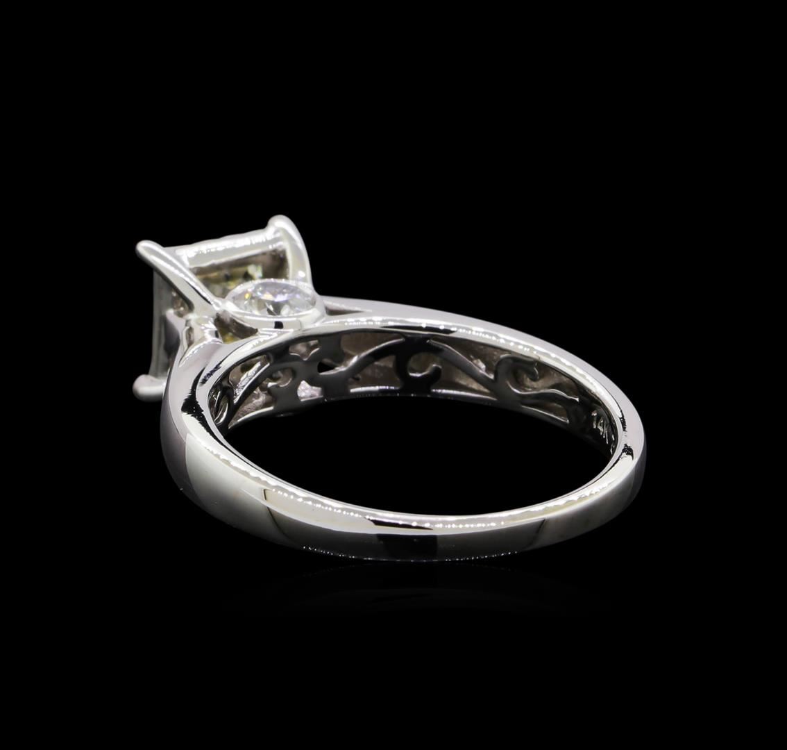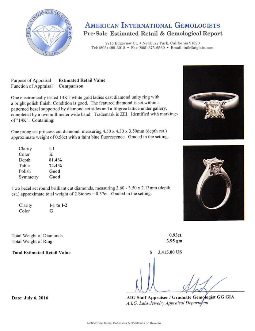 One electronically tested 14KT white gold ladies cast diamond unity ring with a bright polish finish. The featured diamond is set within a patterned bezel supported by diamond set sides and a filigree lattice under gallery, completed by a two millimeter wide band. Trademark is ZEI. Identified with markings of "14K". Condition is good. Containing: One prong set princess cut diamond, measuring 4.50 x 4.30 x 3.50mm (depth est.) approximate weight of 0.56ct with a faint blue fluorescence. Graded in the setting. Clarity: I-1. Color: 81.4%. Table 74.4%. Two bezel set round brilliant cut diamonds, measuring 3.60 - 3.50 x 2.13mm (depth est.) approximate total weight of 2 Stones = 0.37ct. Graded in the setting. Clarity: I-1 to I-2. Color: G. Total Weight of Diamonds 0.93ct. Total Weight of Ring 3.95gm. AIG Appraised at $3,415.00.