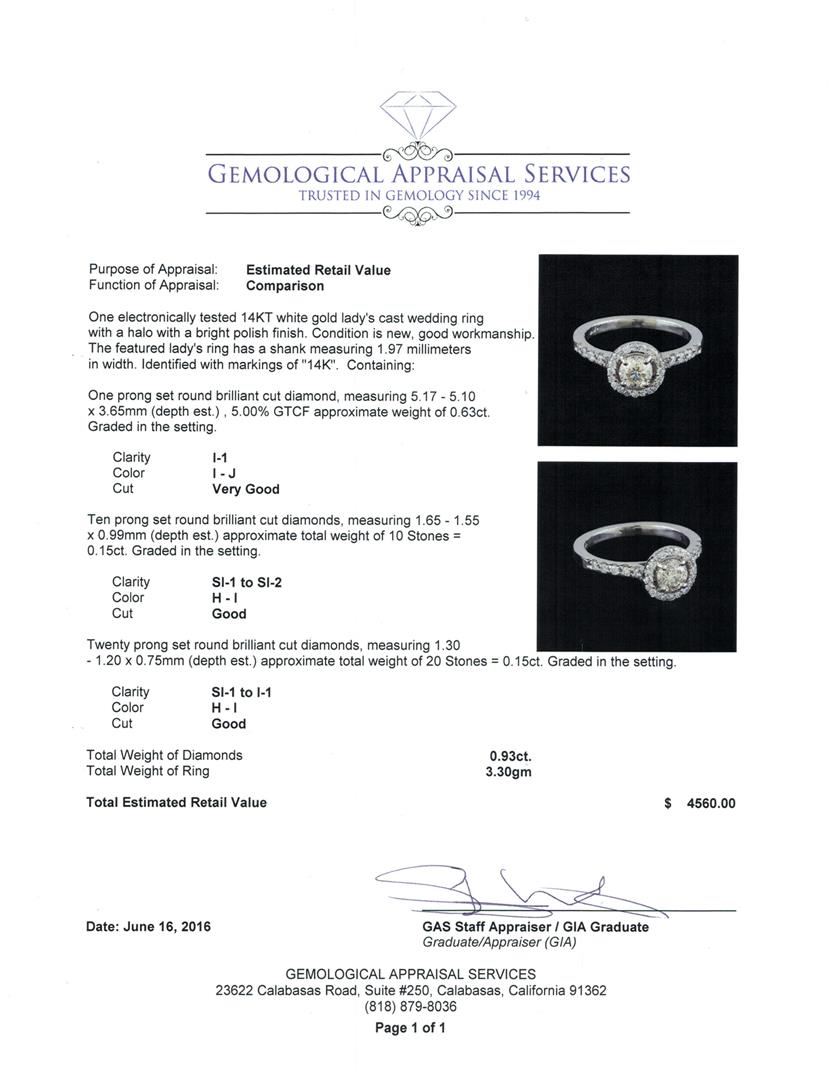 One electronically tested 14KT white gold lady's cast wedding ring with a halo with a bright polish finish. The featured lady's ring has a shank measuring 1.97 millimeters in width. Identified with markings of "14K". Condition is new, good workmanship. Containing: One prong set round brilliant cut diamond, measuring 5.17 - 5.10 x 3.65mm (depth est.) , 5.00.%. GTCF approximate weight of 0.63ct. Graded in the setting. Clarity: I-1. Color: I - Very Good Ten prong set round brilliant cut diamonds, measuring 1.65 - 1.55 x 0.99mm (depth est.) approximate total weight of 10 Stones = 0.15ct. Graded in the setting. Clarity: SI-1 to SI-2. Color: H - I. Cut Good Twenty prong set round brilliant cut diamonds, measuring 1.30 - 1.20 x 0.75mm (depth est.) approximate total weight of 20 Stones = 0.15ct. Graded in the setting. Clarity: SI-1 to I-1. Color: H - I. Cut Good. Total Weight of Diamonds 0.93ct. Total Weight of Ring 3.30gm GAS Appraised at $4,560.00.