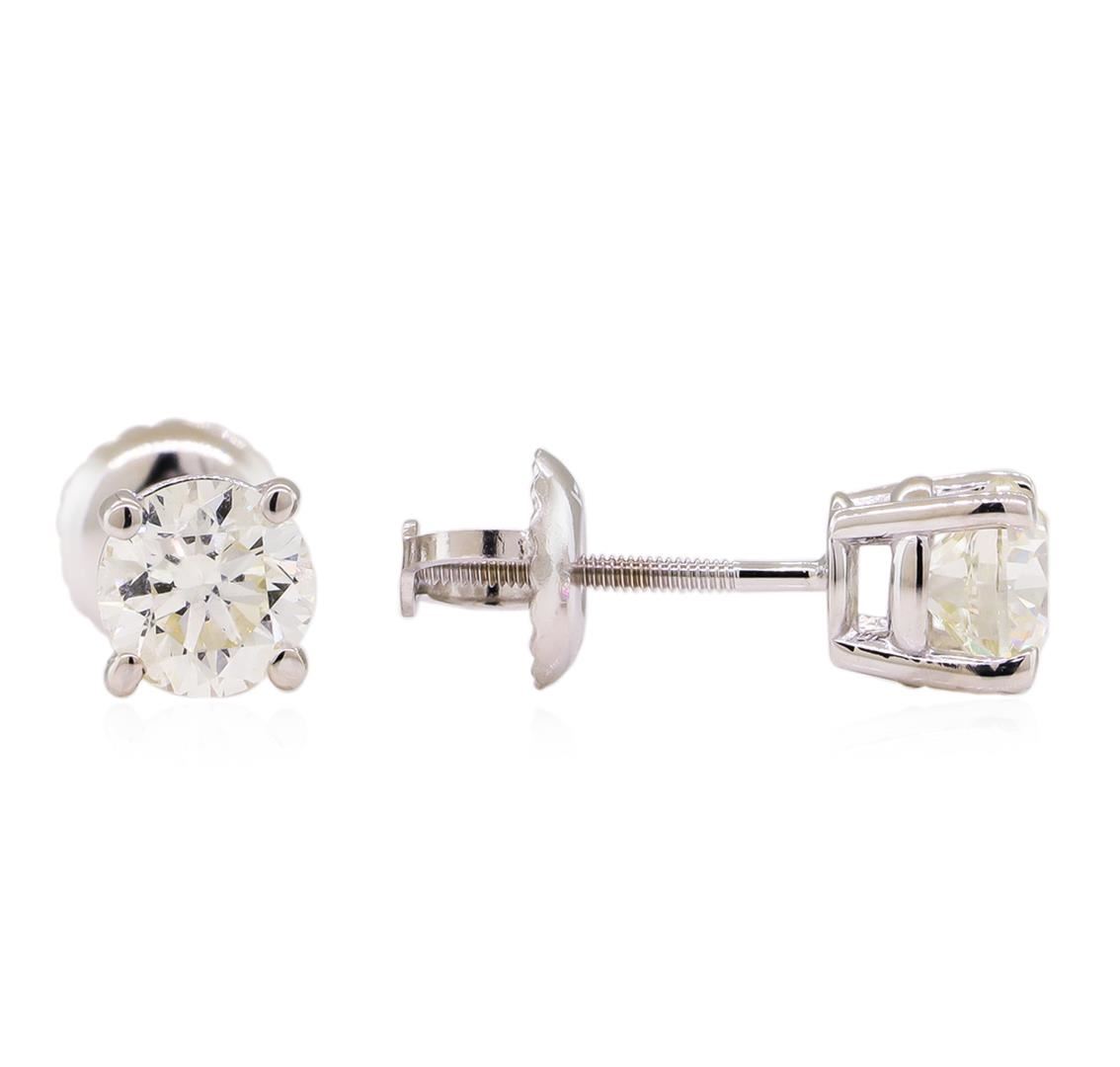 One pair electronically tested 14KT white gold lady's combination cast & assembled stud earrings with threaded posts and screw-on/screw-off backs with a bright polish finish. Identified with markings of "14K". Condition is new, good workmanship. Containing: Two prong set round brilliant cut diamonds, measuring 4.82 - 4.76 x 3.11mm (depth est.) , 5.00.%. GTCF approximate total weight of 2 Stones = 0.93ct. Graded in the setting. Clarity: VS-2 to SI-1. Color: H - I. Cut Very Good. Total Weight of Diamonds 0.93ct. Total Weight of Earrings 1.00gm. GAS Appraised at $6,610.00.