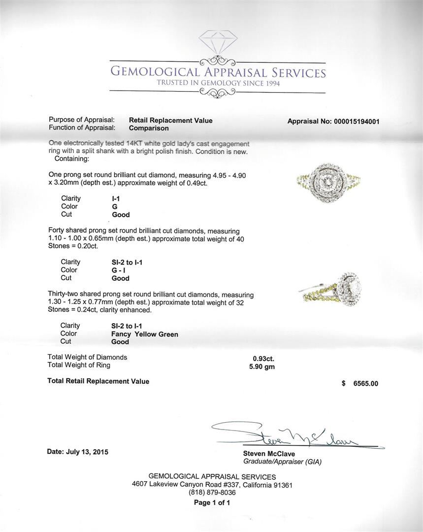 One electronically tested 14KT white gold lady's cast engagement ring with a split shank with a bright polish finish. Condition is new. Containing: One prong set round brilliant cut diamond, measuring 4.95 - 4.90 x 3.20mm (depth est.) approximate weight of 0.49ct. Clarity: I-1. Color: G. Cut: Good. Forty shared prong set round brilliant cut diamonds, measuring 1.10 - 1.00 x 0.65mm (depth est.) approximate total weight of 40 Stones = 0.20ct. Clarity: SI-2 to I-1. Color: G - I. Cut: Good. Thirty-two shared prong set round brilliant cut diamonds, measuring 1.30 - 1.25 x 0.77mm (depth est.) approximate total weight of 32 Stones = 0.24ct, clarity enhanced. Clarity: SI-2 to I-1. Color: Fancy Yellow Green. Cut: Good. Total Weight of Diamonds: 0.93ct. Total Weight of Ring: 5.90 gm. GAS Appraised at $6,565.00.