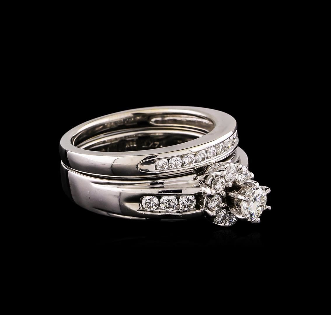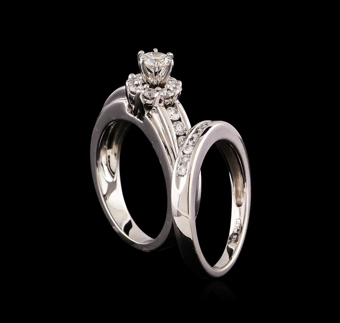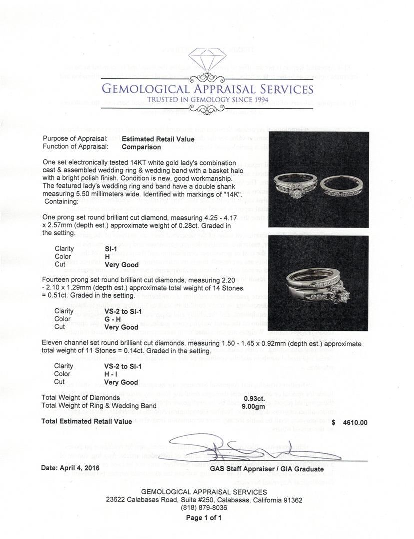 One set electronically tested 14KT white gold lady's combination cast & assembled wedding ring & wedding band with a basket halo with a bright polish finish. The featured lady's wedding ring and band have a double shank measuring 5.50 millimeters wide. Identified with markings of "14K". Condition is new, good workmanship. Containing: One prong set round brilliant cut diamond, measuring 4.25 - 4.17 x 2.57mm (depth est.) approximate weight of 0.28ct. Graded in the setting. Clarity: SI-1. Color: Very Good Fourteen prong set round brilliant cut diamonds, measuring 2.20 - 2.10 x 1.29mm (depth est.) approximate total weight of 14 Stones = 0.51ct. Graded in the setting. Clarity: VS-2 to SI-1. Color: G - Very Good Eleven channel set round brilliant cut diamonds, measuring 1.50 - 1.45 x 0.92mm (depth est.) approximate total weight of 11 Stones = 0.14ct. Graded in the setting. Clarity: VS-2 to SI-1. Color: H - I. Cut Very Good. Total Weight of Diamonds 0.93ct.. Total Weight of Ring & Wedding Band 9.00gm. GAS Appraised at $4,610.00.