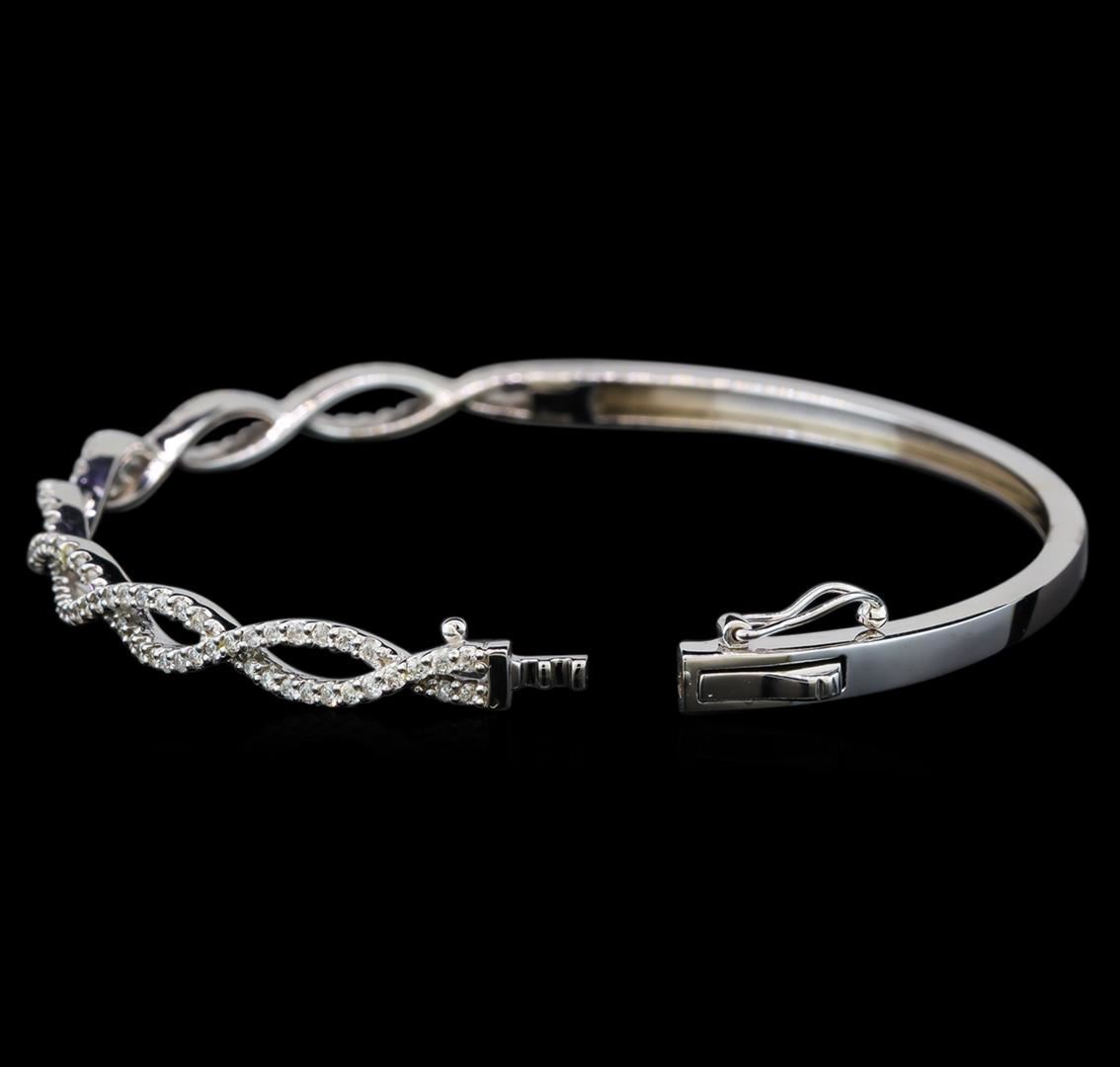 One electronically tested 14KT white gold lady's combination cast & assembled braided fashion bangle bracelet with a tongue clasp with foldover safety with a bright polish finish. The featured lady's bracelet measures approximately 7 inches in length. Identified with markings of 'K14'. Condition is new, good workmanship. Containing: One Hundred Twenty prong set round brilliant cut diamonds, measuring 1.30 - 1.25 x 0.79mm (depth est.) approximate total weight of 120 Stones = 0.94ct. Graded in the setting. Clarity SI-2 to I-2. Color: H - I Cut Good. Total Weight of Diamonds 0.94ct.. Total Weight of Bangle Bracelet 10.70gm. GAS Appraised at $4,590.00.