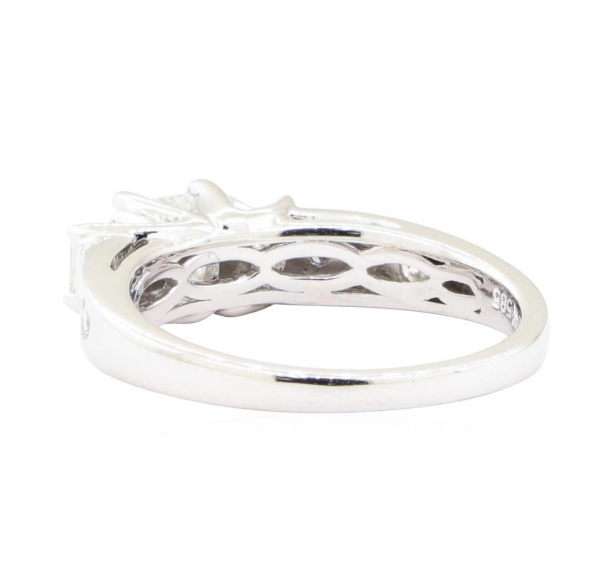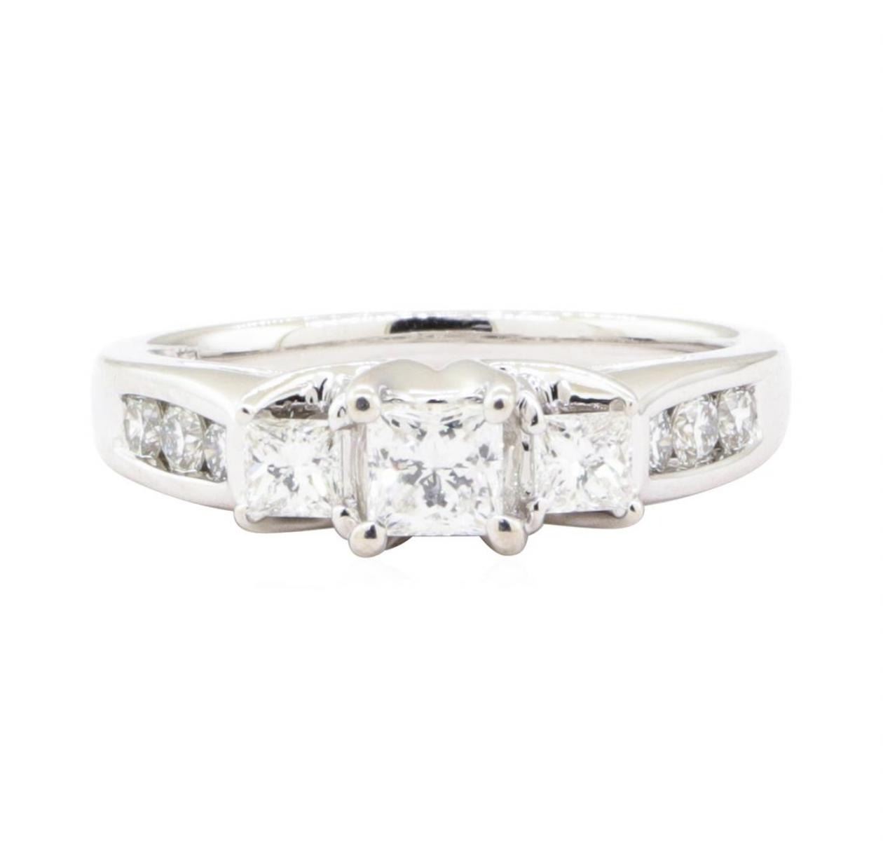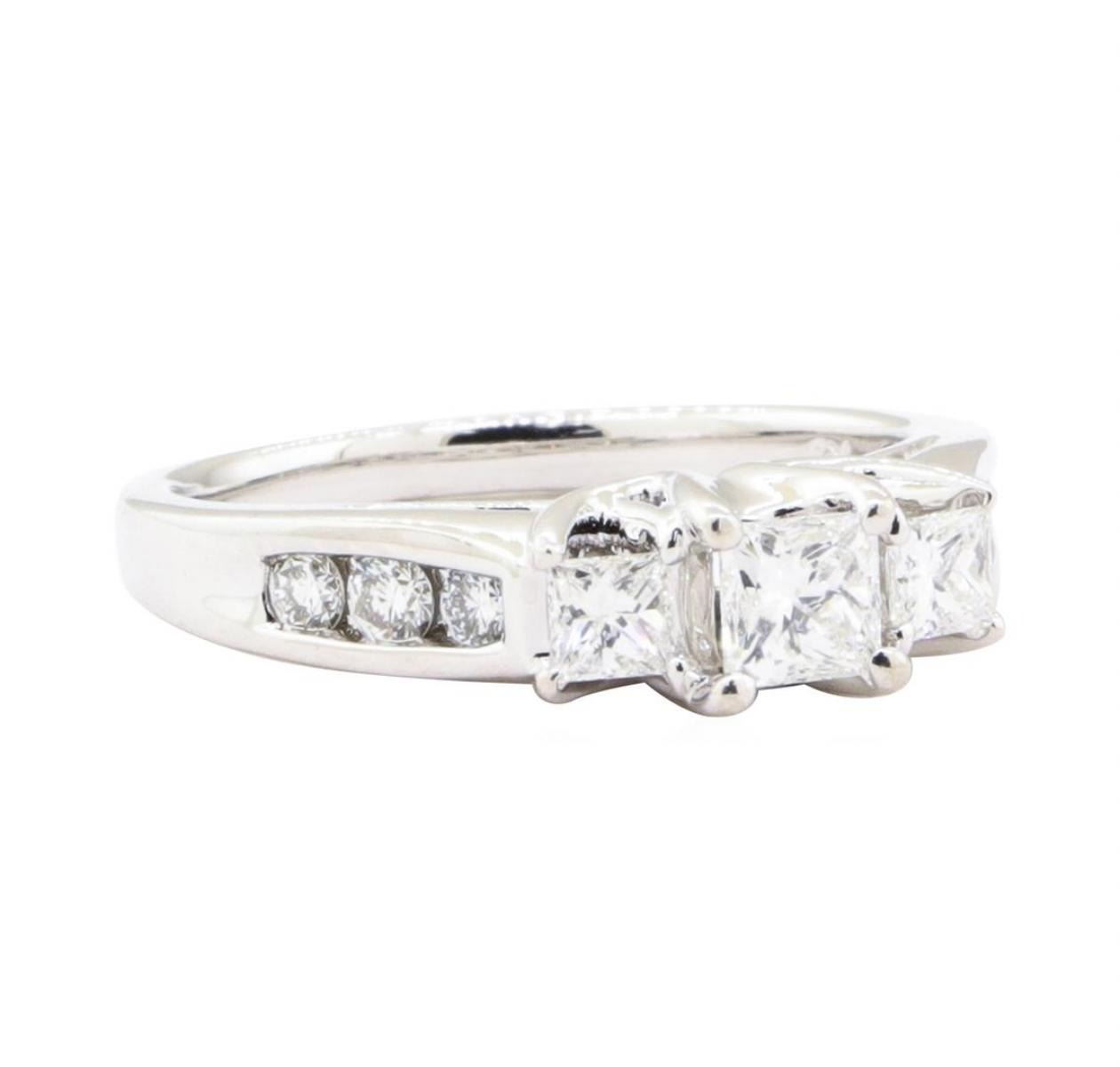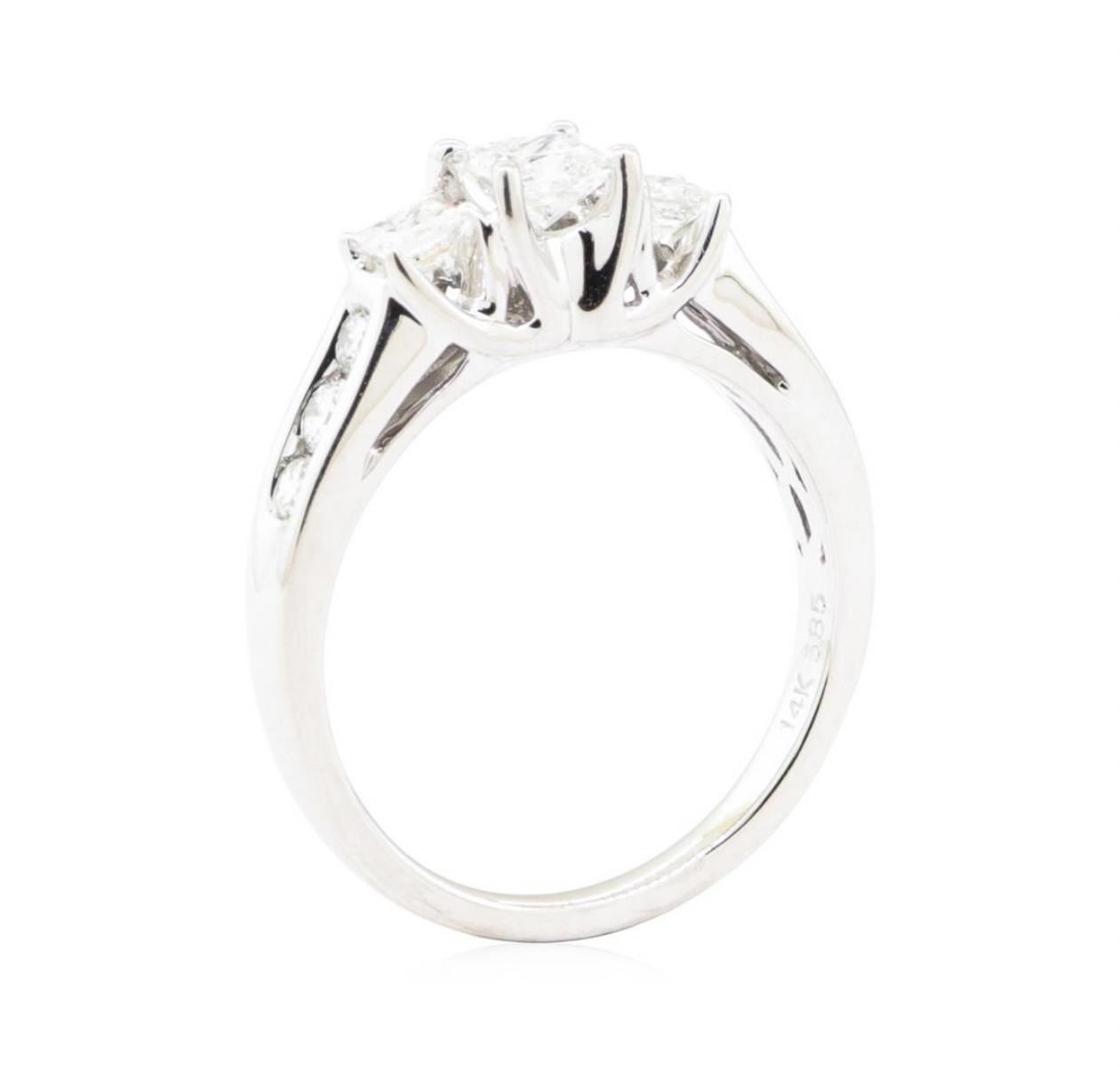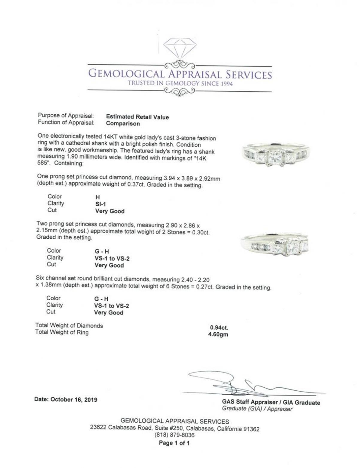 One electronically tested 14KT white gold lady's cast 3-stone fashion ring with a cathedral shank with a bright polish finish. The featured lady's ring has a shank measuring 1.90 millimeters wide. Identified with markings of '14K 585'. Condition is Good. Containing: One prong set princess cut diamond, measuring 3.94 x 3.89 x 2.92mm (depth est.) approximate weight of 0.37ct. Graded in the setting. Color H Clarity SI-1 Cut Very Good Two prong set princess cut diamonds, measuring 2.90 x 2.86 x 2.15mm (depth est.) approximate total weight of 2 Stones = 0.30 ct. Graded in the setting. Color G - H Clarity VS-1 to VS-2 Cut Very Good Six channel set round brilliant cut diamonds, measuring 2.40 - 2.20 x 1.38mm (depth est.) approximate total weight of 6 Stones = 0.27ct. Graded in the setting. Color G - H Clarity VS-1 to VS-2 Cut Very Good. Total Weight of Diamonds 0.94ct.. Total Weight of Ring 4.60gm GAS Appraised at $4015.00. GAS Appraised.
