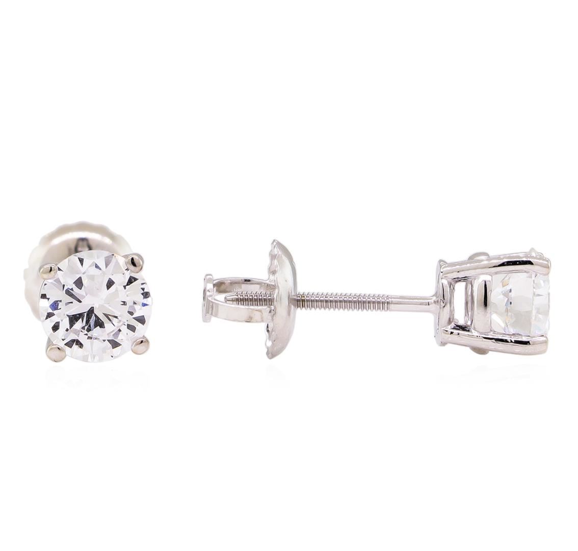 One pair electronically tested 14KT white gold lady's combination cast & assembled stud earrings with threaded posts and screw-on/screw-off backs with a bright polish finish. Identified with markings of "14K". Condition is new, good workmanship. Containing: Two prong set round brilliant cut diamonds, measuring 5.00 - 4.96 x 3.14mm (depth est.) approximate total weight of 2 Stones = 0.94ct. Graded in the setting. Clarity: VS-2 to SI-2. Color: F - Very Good. Total Weight of Diamonds 0.94ct. Total Weight of Earrings 1.00gm. GAS Appraised at $6,675.00.