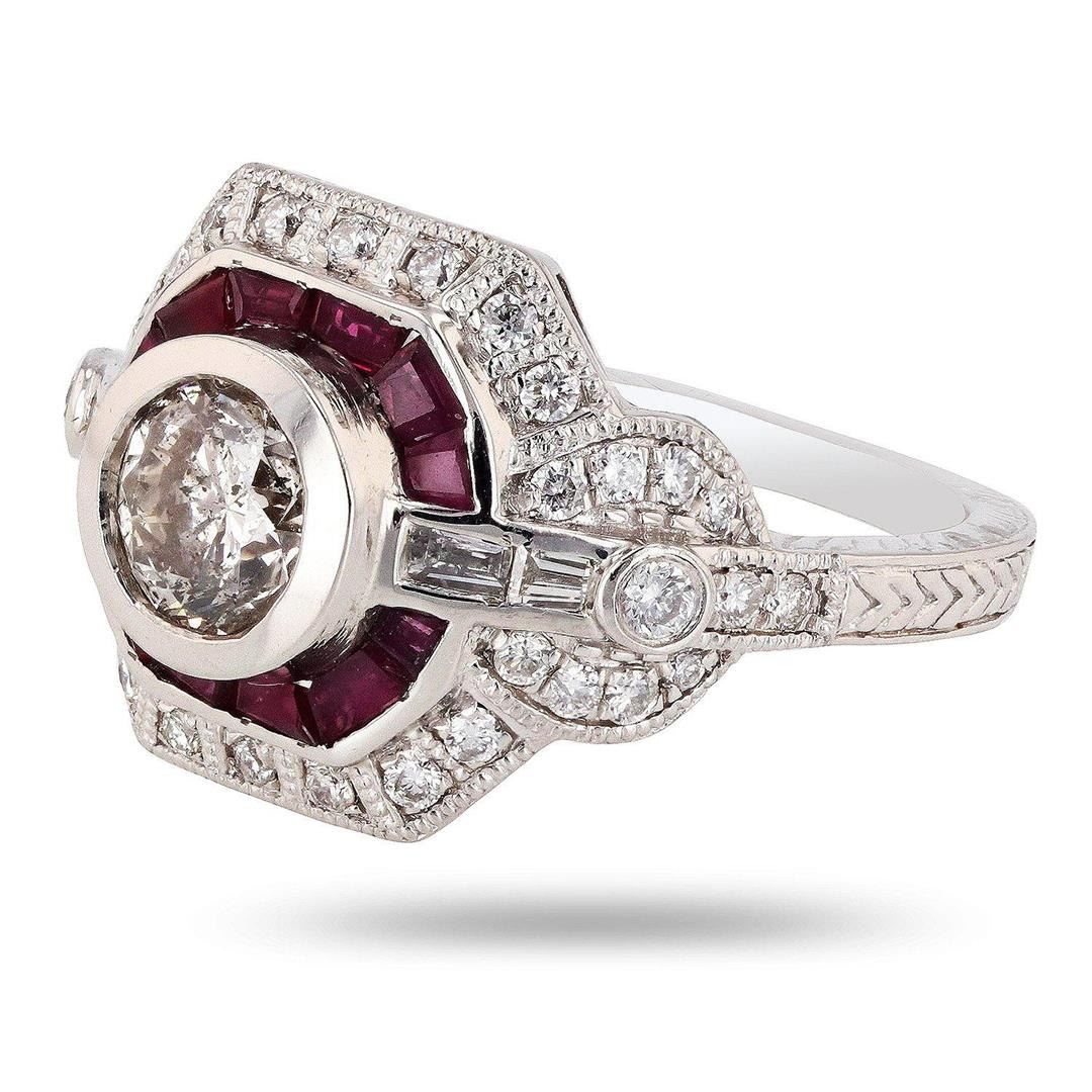 0.94ct Diamond and 0.85ctw Ruby Platinum Ring (1.53ctw Diamonds). DESCRIPTION: ONE PLATINUM LADY'S CUSTOM MADE DIAMOND & RUBY RING. 11.00 GR TW. CONTAINING 1 - MAIN CENTER GEMSTONE(S): IDENTITY: ONE CENTER NATURAL DIAMOND SET IN BEZEL SETTING STYLE. CARAT WEIGHT: 0.94CT. SHAPE & MEASUREMEMT: ROUND BRILLIANT CUT. APPROX : 6.30 MM. QUALITY : I CLARITY , I/J COLOR. ADDITIONAL 12 COUNTS BAGUETTE CUT RUBIES TW: 0.85CT. 2 - ADJACENT GEMSTONES IDENTITY: NATURAL DIAMONDS. SHAPE: ROUND BRILLIANT & BAGUETTE CUT. CARAT WEIGHT: 0.59CT TW. QUALITY : H COLOR. SI CLARITY. ALL FINE CUTTING AND PROPORTIONS. ALL PRONGS & CHANNEL SETTINGS STYLE. TOTAL GEMSTONES WEIGHT: 2.38CT TW.