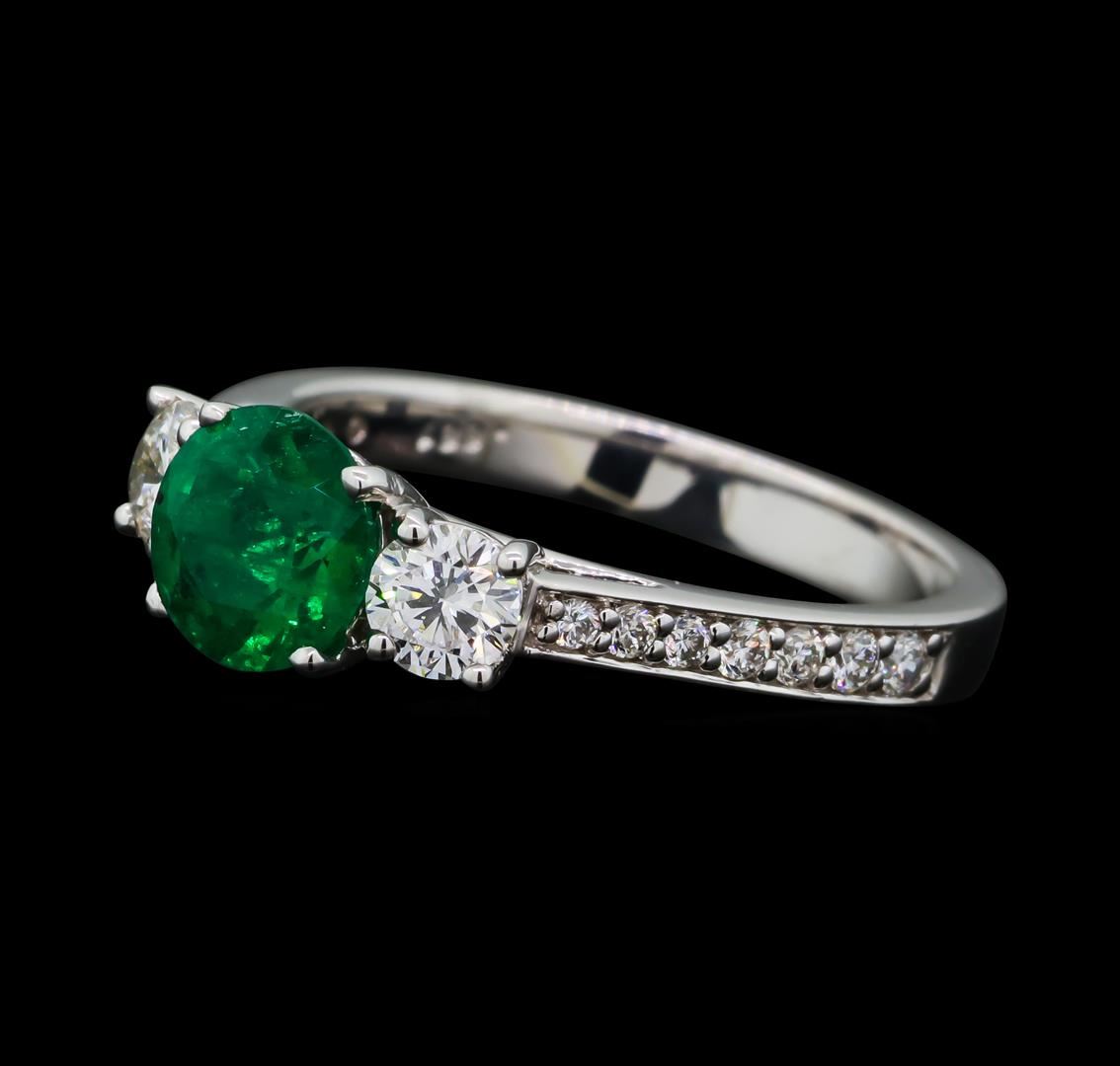 One electronically tested 14KT white gold ladies cast emerald and diamond ring with a bright polish finish. The featured emerald is accented by a single diamond on either side supported by diamond set shoulders, completed by a two and one-half millimeter wide band. Identified with markings of '14K'. Condition is good. Containing: One prong set round mixed cut natural emerald, measuring 6.52 - 6.50 x 4.25 mm, approximate weight of 0.94ct., clarity is heavily included, type III, medium dark, moderately strong, green color, (GIA G 6/4), cut is good. Transmitting light somewhat diffusely, transparent to translucent. Naturally occurring internal & external characteristics are present. Indications of oil residue. Graded in the setting. Two prong set round brilliant cut diamonds, measuring 4.00 - 3.90 x 2.37mm (depth est.) approximate total weight of 2 Stones = 0.50ct. Graded in the setting. Clarity SI-1. Color: G Fourteen prong set round brilliant cut diamonds, measuring 1.60 - 1.30 x 0.87mm (depth est.) approximate total weight of 14 Stones = 0.16ct. Graded in the setting. Clarity VS-2 to SI-1. Color: F - G. Total Weight of Colored Stones 0.94ct.. Total Weight of Diamonds 0.66ct.. Total Weight of Ring 3.77gm. AIG Appraised at $5,615.00.
