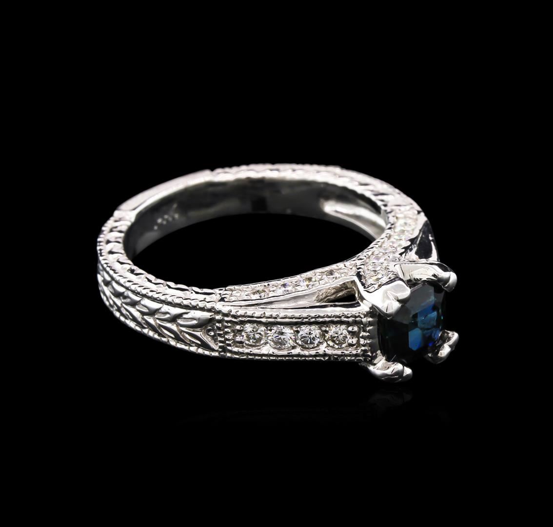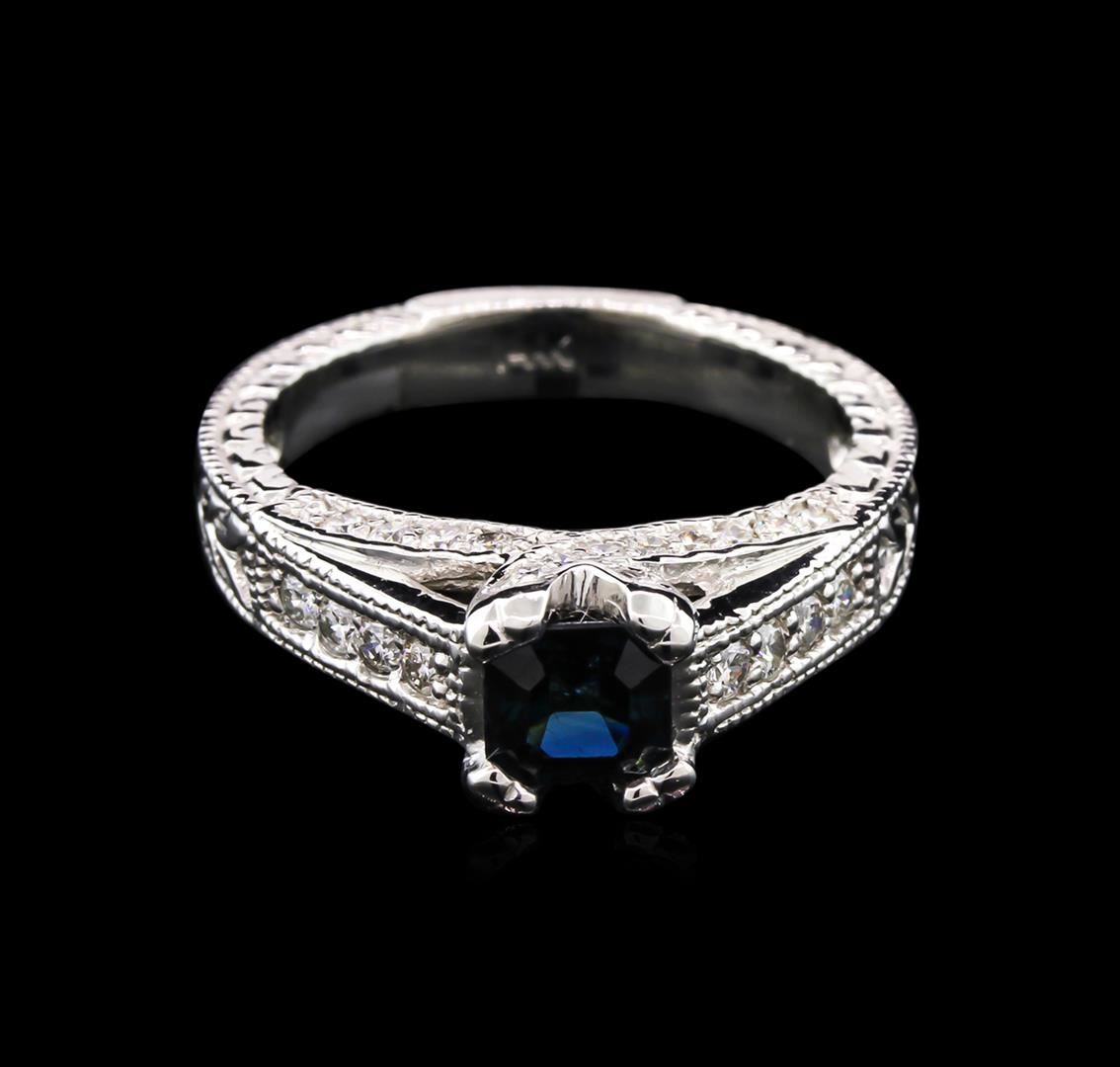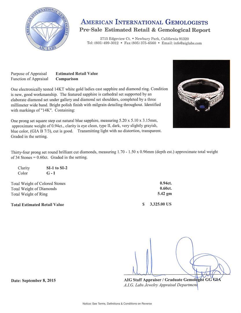 One electronically tested 14KT white gold ladies cast sapphire and diamond ring. The featured sapphire is cathedral set supported by an elaborate diamond set under gallery and diamond set shoulders, completed by a three millimeter wide band. Bright polish finish with milgrain detailing throughout. Identified with markings of "14K". Condition is new, good workmanship. Containing: One prong set square step cut natural blue sapphire, measuring 5.20 x 5.10 x 3.15mm, approximate weight of 0.94ct., clarity is eye clean, type II, dark, very slightly grayish, blue color, (GIA B 7/3), cut is good. Transmitting light with no distortion, transparent. Graded in the setting. Thirty-Four prong set round brilliant cut diamonds, measuring 1.70 - 1.50 x 0.96mm (depth est.) approximate total weight of 34 Stones = 0.60ct. Graded in the setting. Clarity: SI-1 to SI-2. Color: G - I. Total Weight of Colored Stones 0.94ct. Total Weight of Diamonds 0.60ct. Total Weight of Ring 5.42gm. AIG Appraised at $3,325.00.