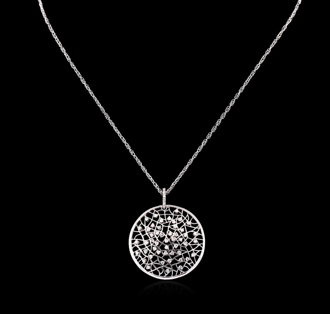 One electronically tested 14KT white gold ladies cast & assembled diamond pendant with chain. The thirty five millimeter domed lattice disc features a network of round brilliant diamonds supported by a diamond set bail, completed by a one millimeter wide eighteen inch length designer style chain. Trademark is Fancy. Identified with markings of "14K ITALY". Condition is new, good workmanship. Containing: Fifty-Seven prong set round brilliant cut diamonds, measuring 1.70 - 1.30 x 0.90mm exact total weight 57 Stones = 0.94ct. Graded in the setting. Clarity: SI-2 to I-2. Color: G - H. Total Weight of Diamonds 0.94ct. Total Weight of Pendant With Chain 9.25gm. AIG Appraised at $3,880.00.