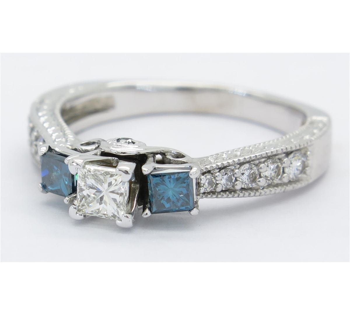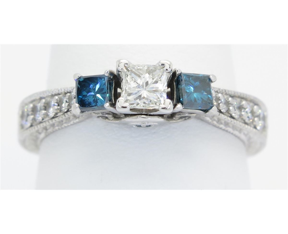 One tested 14K white gold diamond ring. Containing: One Princess Cut Diamond. Approximate size: .33CT, Clarity: SI, Color: G-H. Two Irradiated Blue Princess Cut Diamonds, 12 Round Brilliant Cut Diamonds. Approximate total diamond weight: .94CTW. Diamonds are graded in the mounting, unless otherwise stated. Weight: 4.3 grams. Size: 7.5