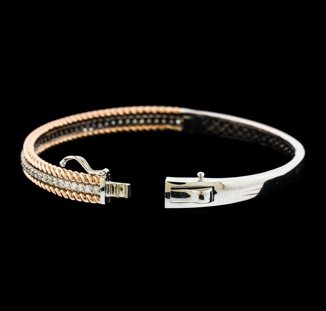 One electronically tested 14KT rose and white gold lady's combination cast & assembled fashion bangle bracelet with a tongue clasp with foldover safety with a bright polish finish. The featured lady's bracelet measures approximately 7 inches in length. Identified with markings of 'K14'. Condition is new, good workmanship. Containing: Fifty prong set round brilliant cut diamonds, measuring 1.75 - 1.65 x 1.05mm (depth est.) approximate total weight of 50 Stones = 0.95ct. Graded in the setting. Clarity SI-1 to I-1. Color: G - I Cut Good. Total Weight of Diamonds 0.95ct.. Total Weight of Bangle Bracelet 18.40gm. GAS Appraised at $5,375.00.