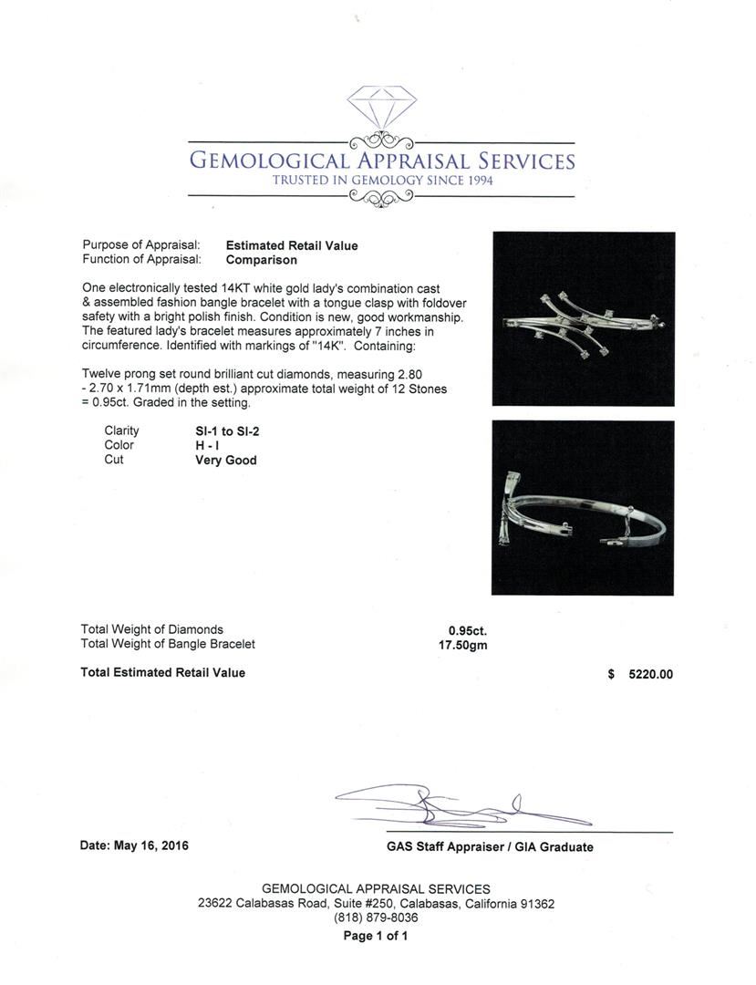 One electronically tested 14KT white gold lady's combination cast & assembled fashion bangle bracelet with a tongue clasp with foldover safety with a bright polish finish. The featured lady's bracelet measures approximately 7 inches in circumference. Identified with markings of "14K". Condition is new, good workmanship. Containing: Twelve prong set round brilliant cut diamonds, measuring 2.80 - 2.70 x 1.71mm (depth est.) approximate total weight of 12 Stones = 0.95ct. Graded in the setting. Clarity: SI-1 to SI-2. Color: H - I. Cut Very Good. Total Weight of Diamonds 0.95ct. Total Weight of Bangle Bracelet 17.50gm. GAS Appraised at $5,220.00.
