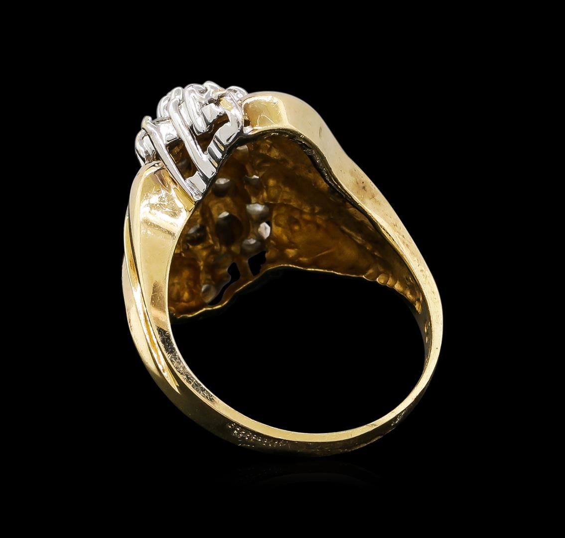 One electronically tested 10KT yellow gold ladies cast diamond ring. The ring features a cascading diamond cluster supported by scalloped shoulders, completed by a two millimeter wide band. Bright polish finish with rhodium accents. Identified with markings of "10K". Condition is good. Containing: Twenty-Five prong set round brilliant cut diamonds, measuring 2.20 - 2.00 x 1.26mm (depth est.) approximate total weight of 25 Stones = 0.95ct. Graded in the setting. Clarity: I-2 to I-3. Color: I - K. Total Weight of Diamonds 0.95ct. Total Weight of Ring 6.45 grams. AIG Appraised.