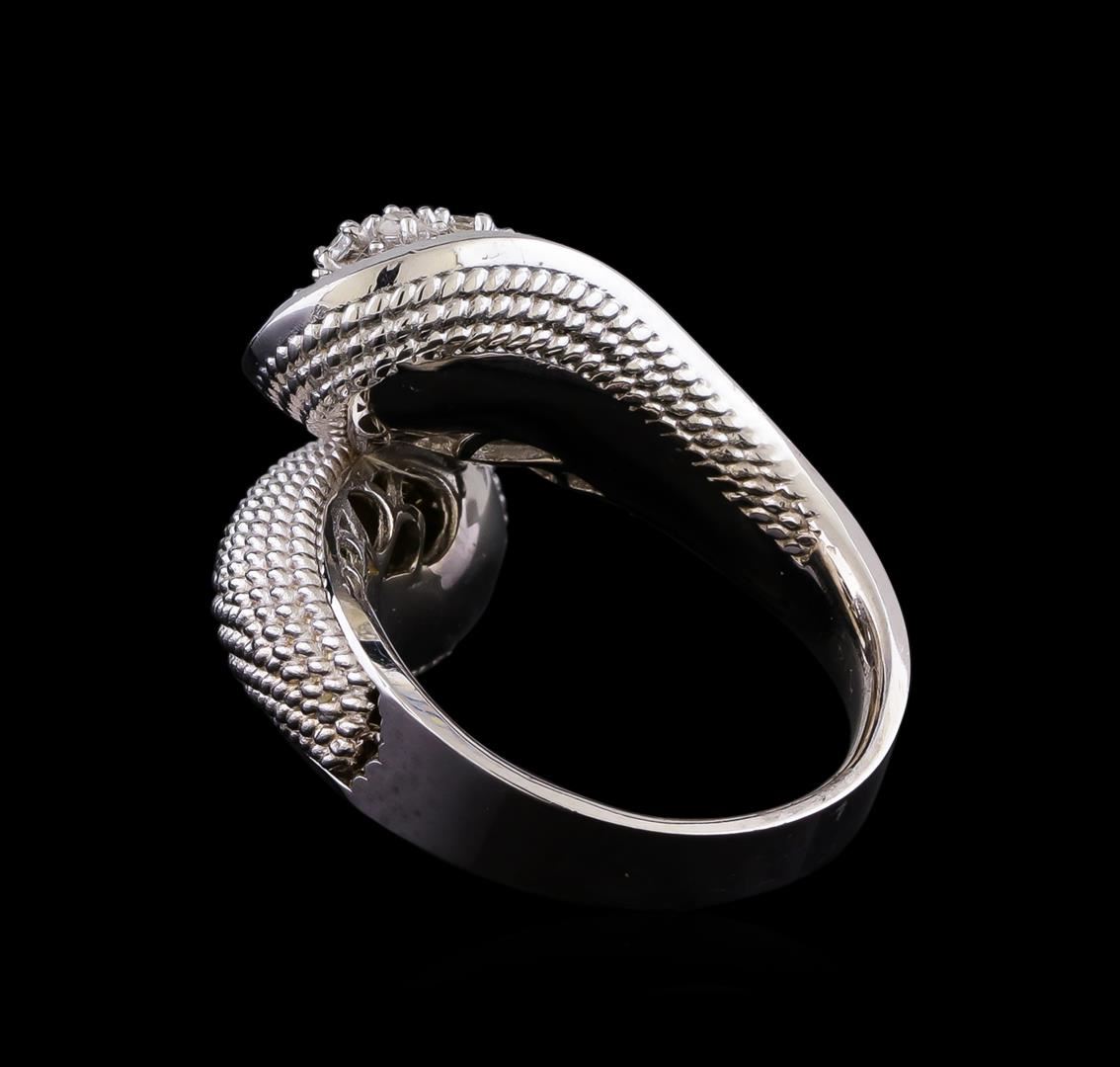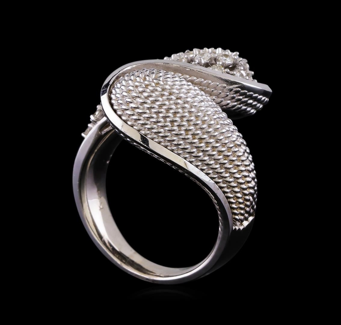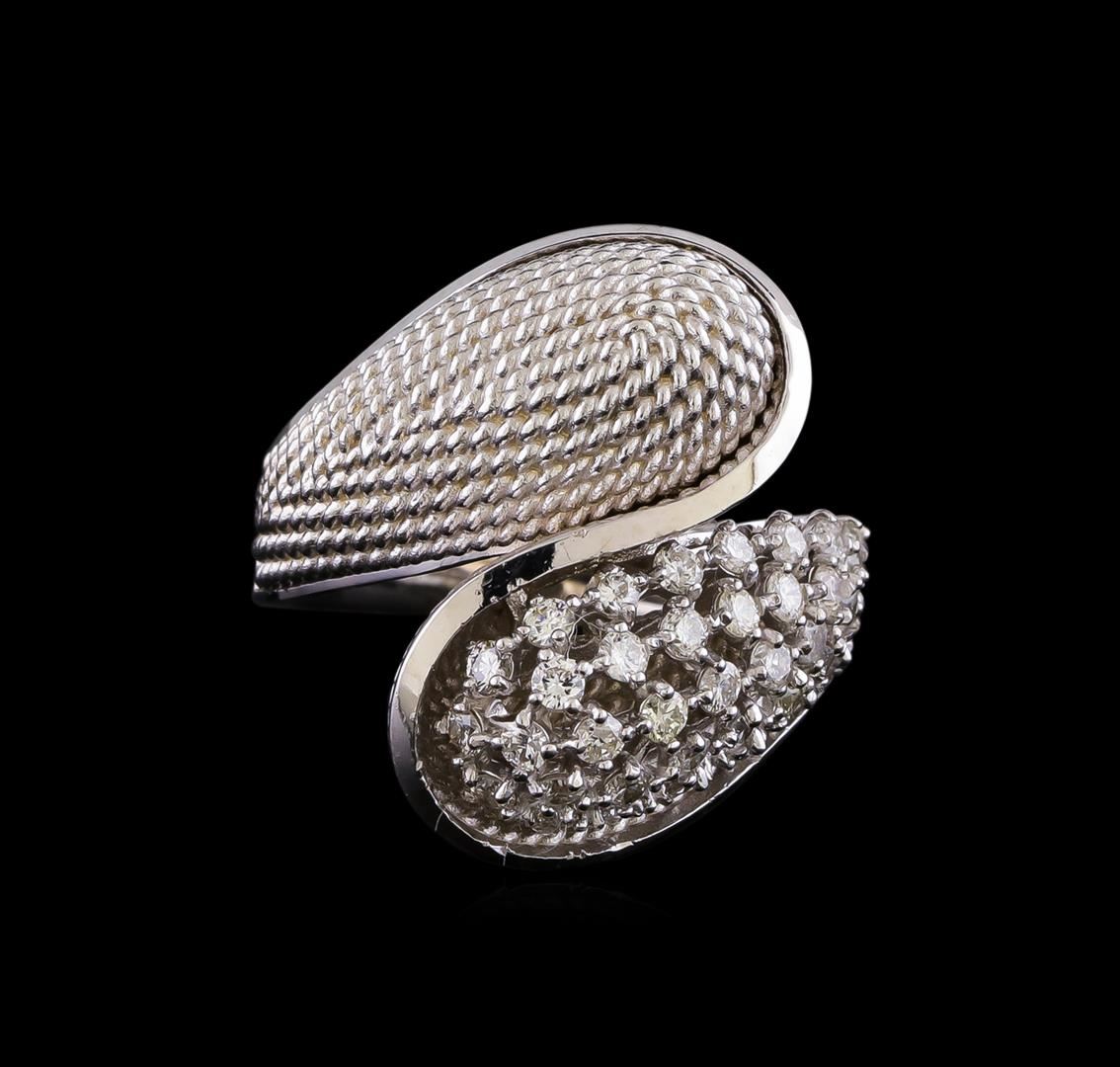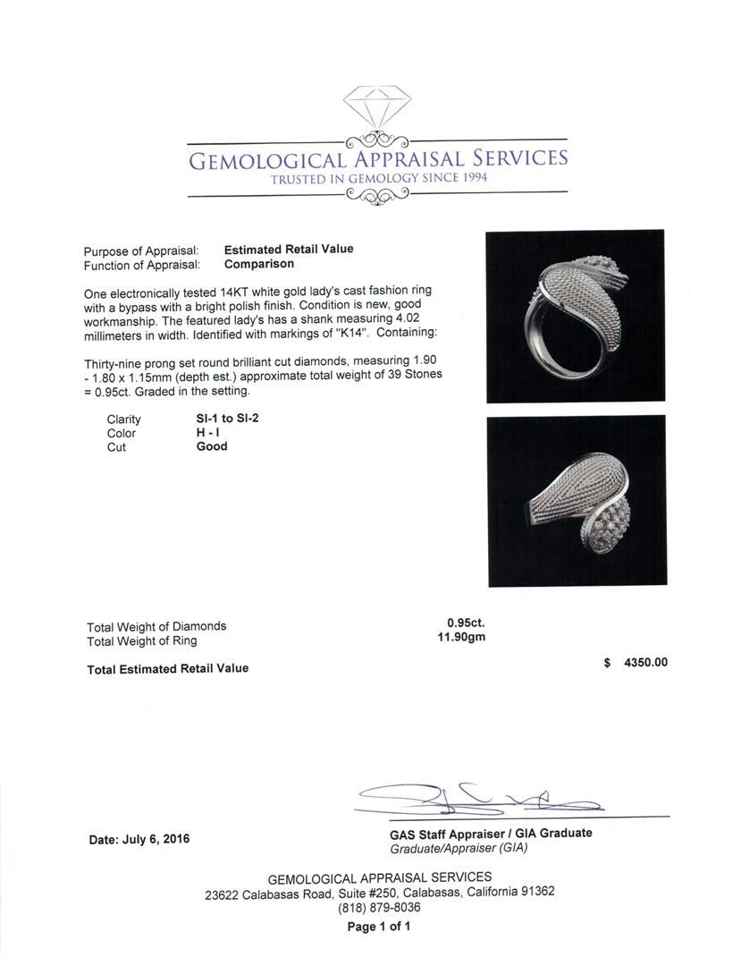 One electronically tested 14KT white gold lady's cast fashion ring with a bypass with a bright polish finish. The featured lady's has a shank measuring 4.02 millimeters in width. Identified with markings of "K14". Condition is new, good workmanship. Containing: Thirty-Nine prong set round brilliant cut diamonds, measuring 1.90 - 1.80 x 1.15mm (depth est.) approximate total weight of 39 Stones = 0.95ct. Graded in the setting. Clarity: SI-1 to SI-2. Color: H - I. Cut Good. Total Weight of Diamonds 0.95ct. Total Weight of Ring 11.90gm. GAS Appraised.