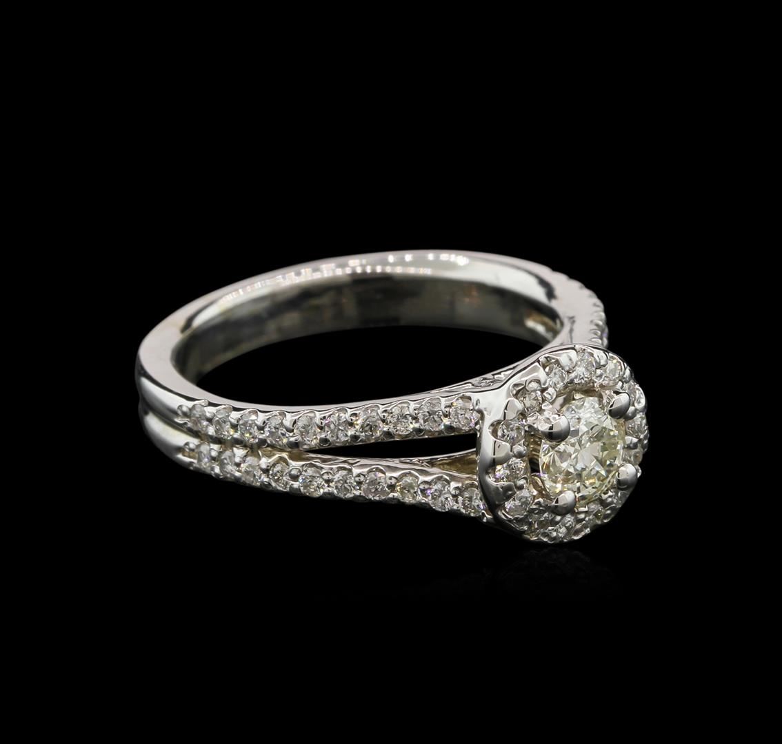 One electronically tested 14KT white gold ladies cast diamond unity ring with a bright polish finish. The featured diamond is set within a diamond set bezel supported by diamond set split shoulders, completed by a grooved three millimeter wide band. Condition is new, good workmanship. Containing: One prong set round brilliant cut diamond, measuring 4.80 - 4.70 x 2.85mm exact weight 0.44ct. Graded in the setting. Clarity: I-1. Color: J. Depth 60.0%. Table 59.0%. Fifty-Four prong set round brilliant cut diamonds exact total weight 54 Stones = 0.51ct. Graded in the setting. Clarity: SI-2 to I-1. Color: G - I. Total Weight of Diamonds 0.95ct. Total Weight of Ring 5.22gm. AIG Appraised at $4,005.00.