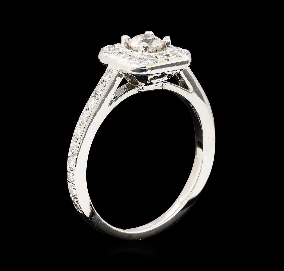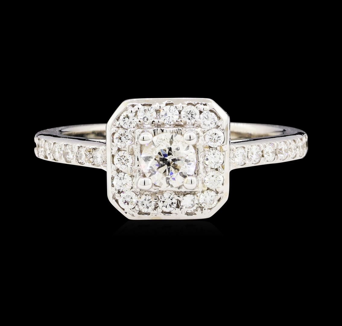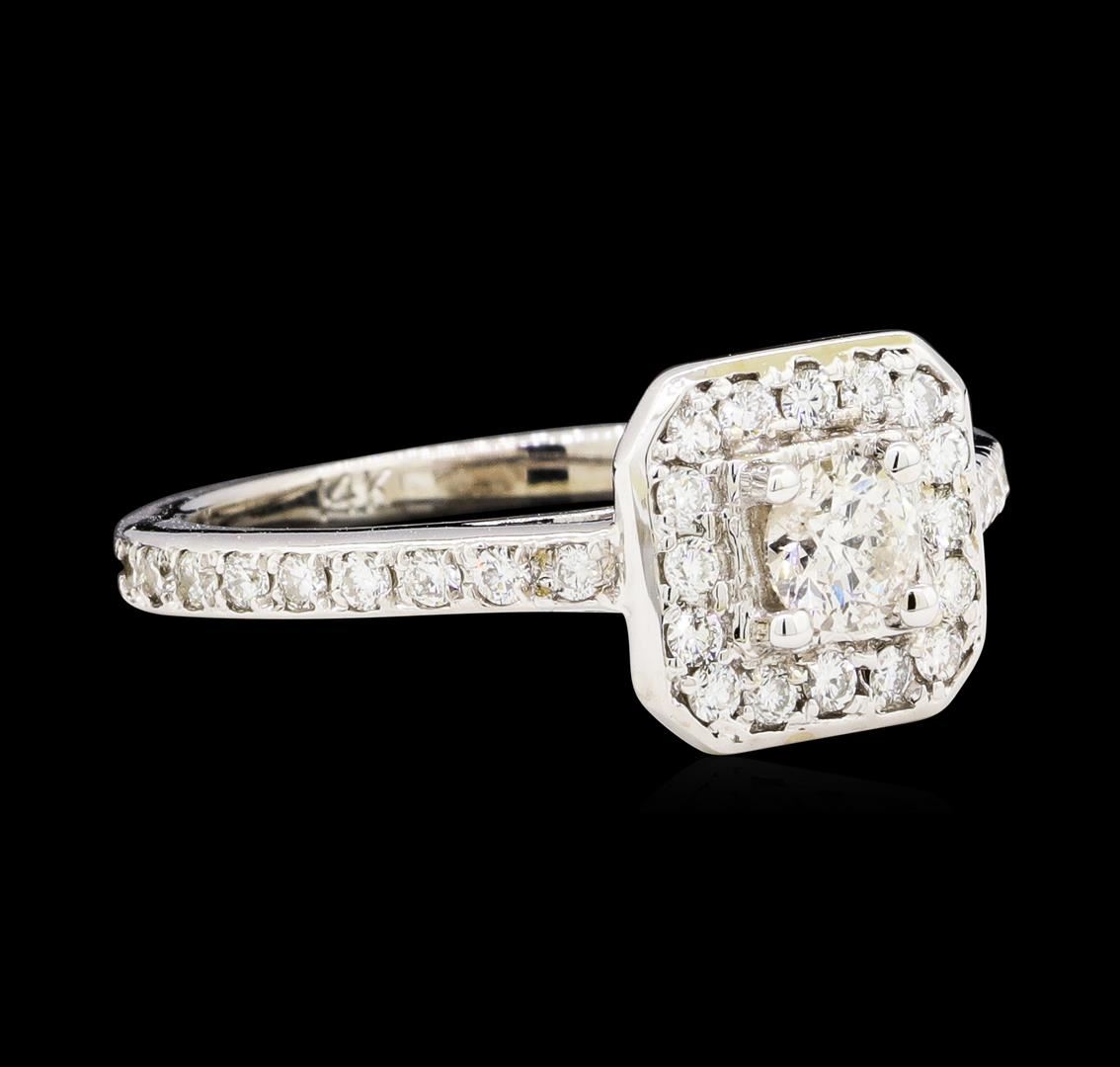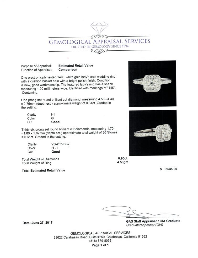 One electronically tested 14KT white gold lady's cast wedding ring with a cushion basket halo with a bright polish finish. The featured lady's ring has a shank measuring 1.90 millimeters wide. Identified with markings of '14K'. Condition is new, good workmanship. Containing: One prong set round brilliant cut diamond, measuring 4.50 - 4.40 x 2.76mm (depth est.) approximate weight of 0.34ct. Graded in the setting. Color G Clarity I-1 Cut Good Thirty-Six prong set round brilliant cut diamonds, measuring 1.70 - 1.60 x 1.02mm (depth est.) approximate total weight of 36 Stones = 0.61ct. Graded in the setting. Color H - I Clarity VS-2 to SI-2 Cut Good. Total Weight of Diamonds 0.95ct.. Total Weight of Ring 4.50gm GAS Appraised at $3535.00. GAS Appraised at $3,535.00.