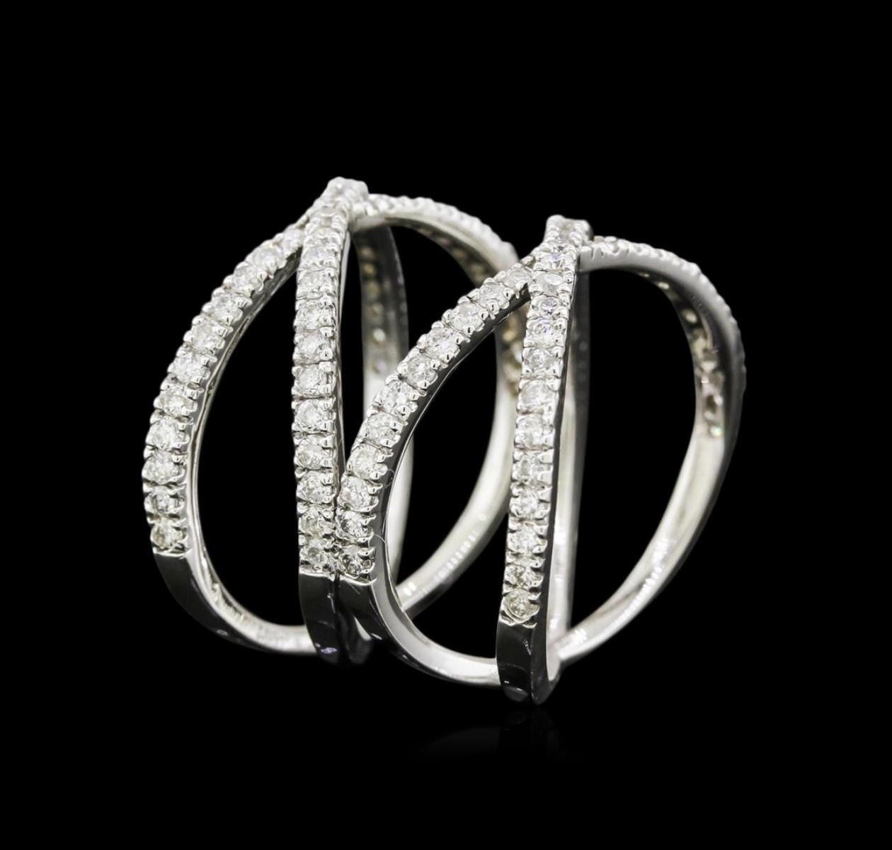 One electronically tested 14KT white gold lady's combination cast & assembled fashion ring with a split shank with a bright polish finish. The featured lady's ring has a double band crossover motif with a shank measuring 10.69 millimeters wide. Identified with markings of "K14". Condition is new, good workmanship. Containing: Ninety-Four prong set round brilliant cut diamonds, measuring 1.40 - 1.35 x 0.88mm (depth est.) approximate total weight of 94 Stones = 0.95ct. Graded in the setting. Clarity: SI-2 to I-1. Color: H - I. Cut Good. Total Weight of Diamonds 0.95ct. Total Weight of Ring 5.30gm. GAS Appraised.