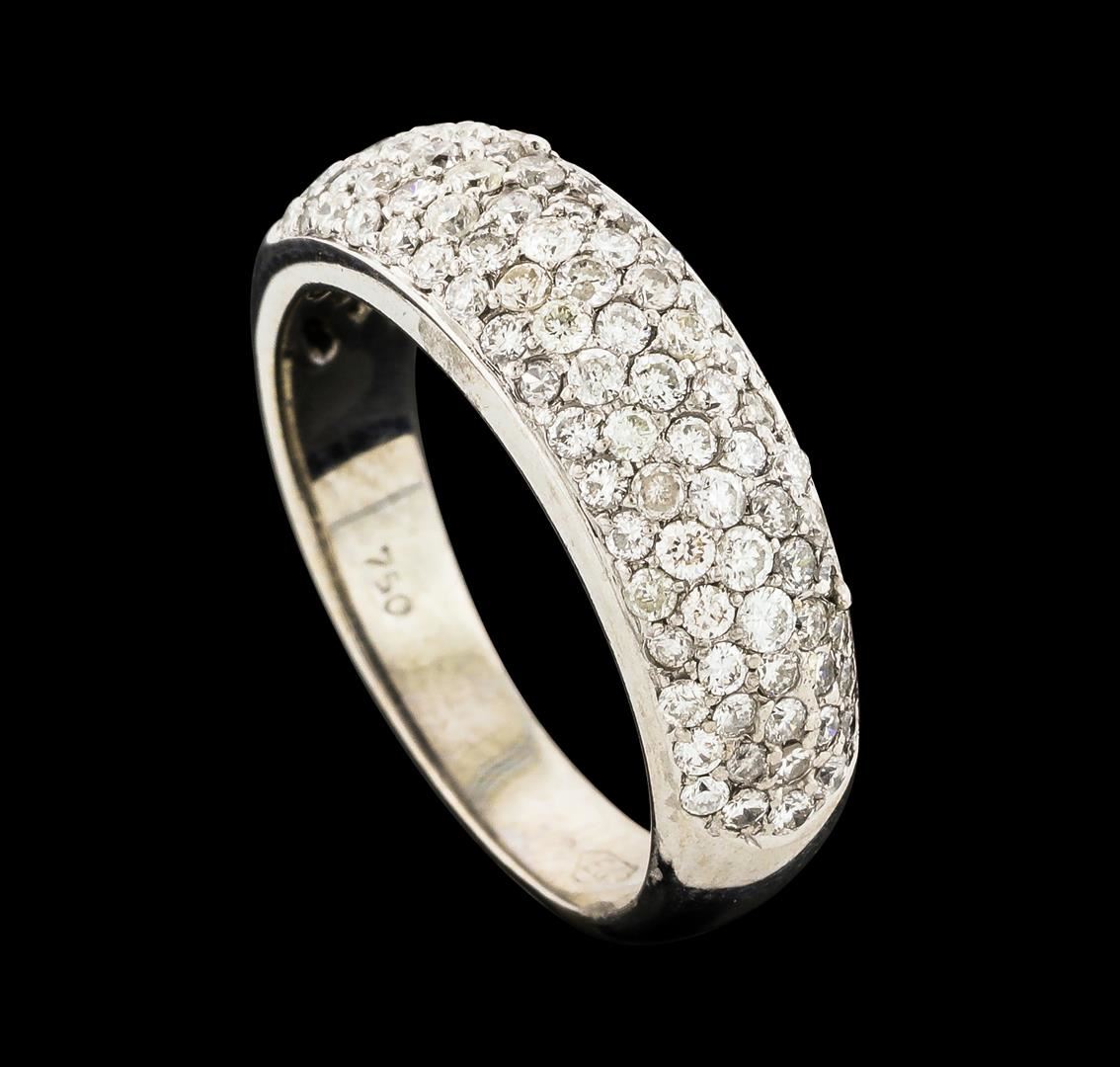 One electronically tested 18KT white gold lady's cast fashion ring with a five-row pave dome with a bright polish finish. The featured lady's ring has a shank measuring 3.26 millimeters wide. Identified with markings of '750'. Condition is like new, good workmanship. Containing: Eighty-Nine pave' set round brilliant cut diamonds, measuring 1.50 - 1.25 x 0.86mm (depth est.) approximate total weight of 89 Stones = 0.95ct. Graded in the setting. Clarity SI-1 to I-1. Color: H - I Cut Good. Total Weight of Diamonds 0.95ct.. Total Weight of Ring 4.20gm. GAS Appraised at $3,115.00.