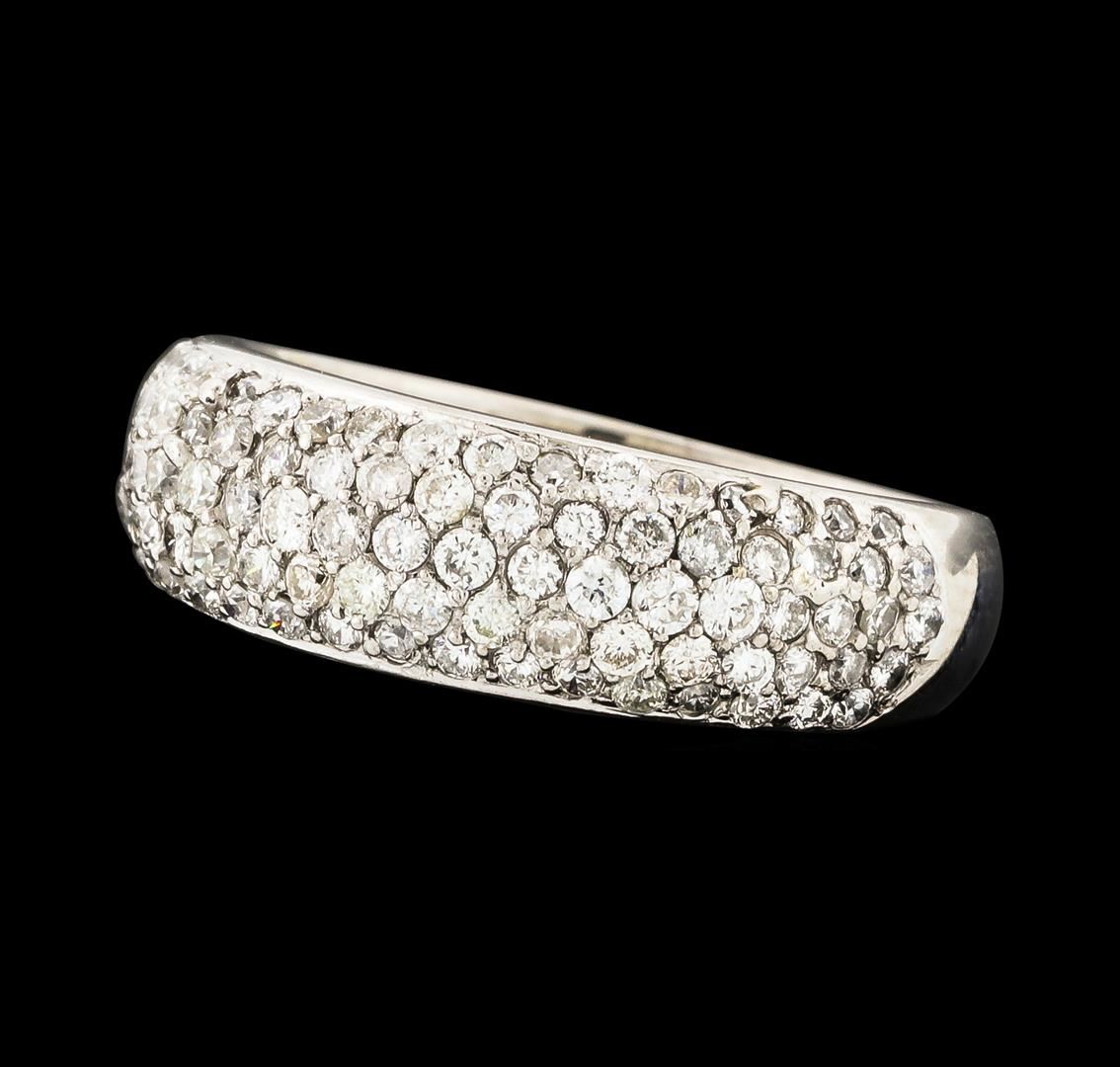 One electronically tested 18KT white gold lady's cast fashion ring with a five-row pave dome with a bright polish finish. The featured lady's ring has a shank measuring 3.26 millimeters wide. Identified with markings of '750'. Condition is like new, good workmanship. Containing: Eighty-Nine pave' set round brilliant cut diamonds, measuring 1.50 - 1.25 x 0.86mm (depth est.) approximate total weight of 89 Stones = 0.95ct. Graded in the setting. Clarity SI-1 to I-1. Color: H - I Cut Good. Total Weight of Diamonds 0.95ct.. Total Weight of Ring 4.20gm. GAS Appraised at $3,115.00.