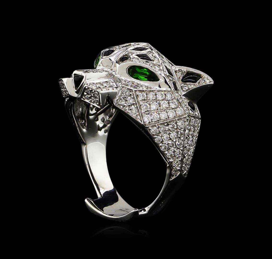 One electronically tested 18KT white gold cast chrome diopside, onyx & diamond ring. The ring features an artistic diamond encrusted jaguar head with chrome diopside eyes and spotted onyx accents, completed by a six millimeter wide band. Bright and patterned finish. Trademark is MICHA. Identified with markings of "18K 750". Condition is new, good workmanship. Containing: Two bezel set pear mixed cut natural chrome diopsides, measuring 4.50 x 2.00 x 1.10mm, approximate total weight of 0.14ct., clarity is eye clean, medium dark, moderately strong, green color, (GIA G 6/4), cut is good. Measurements & the color grade are an average for the pair. Graded in the setting. Twenty-one bezel set cabochon cut natural onyxs approximate total weight of 0.46ct., black, very slightly grayish, black color, (GIA Bl 10/3), cut is good. Transmitting light very diffusely, opaque. Naturally occurring internal & external characteristics are present. Color grade is an average for the group. Graded in the setting. One Hundred Eighty-Seven prong set round brilliant cut diamonds approximate total weight of 187 Stones = 0.95ct. Graded in the setting. Clarity: SI-2 to I-2. Color: E - G. Total Weight of Colored Stones 0.60ct. Total Weight of Diamonds 0.95ct. Total Weight of Ring 10.83gm. AIG Appraised at $6,150.00.