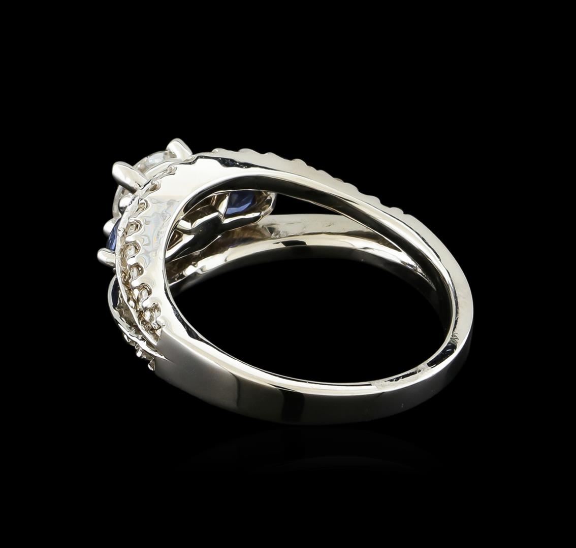 One electronically tested 14KT white gold lady's cast wedding ring with a split shank with a bright polish finish. The featured lady's ring has a shank measuring 2.38 millimeters wide. Identified with markings of "K14". Condition is new, good workmanship. Containing: Two prong set round modified brilliant cut natural blue sapphires, measuring 3.70 - 3.60 x 2.38 mm, approximate total weight of 0.50ct., clarity is slightly included, type II, medium dark, moderately strong, blue color, (GIA B 6/4), cut is very good. Transmitting light with a minimum of distortion, transparent. Colored gemstones are presumed to have been subjected to commonly used enhancement processes. Graded in the setting. One prong set round brilliant cut diamond, measuring 5.43 - 5.41 x 3.47mm (depth est.) approximate weight of 0.62ct. Graded in the setting. Clarity: I-1. Color: I. Cut Good Thirty-Four prong set round brilliant cut diamonds, measuring 1.40 - 1.30 x 0.84mm (depth est.) approximate total weight of 34 Stones = 0.33ct. Graded in the setting. Clarity: SI-1 to I-1. Color: G - Good. Total Weight of Colored Stones 0.50ct. Total Weight of Diamonds 0.95ct. Total Weight of Ring 5.20gm. GAS Appraised at $5,105.00.