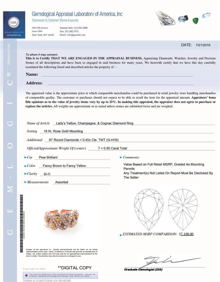 One Lady' s Yellow, Champagne, and Cognac Diamond Ring. Setting: 18 Kt. Rose Gold Mounting. Additional: 67 Round Diamonds = 0.45 Cts. TWT (G-H/SI). Official/Approximate Weight of Center: 7 = 0.95 Carat Total. Cut: Pear Brilliant. Color: Fancy Brown to Fancy Yellow. Clarity: SI-I1. Measurements: Assorted. Total Weight: 8.44 grams.