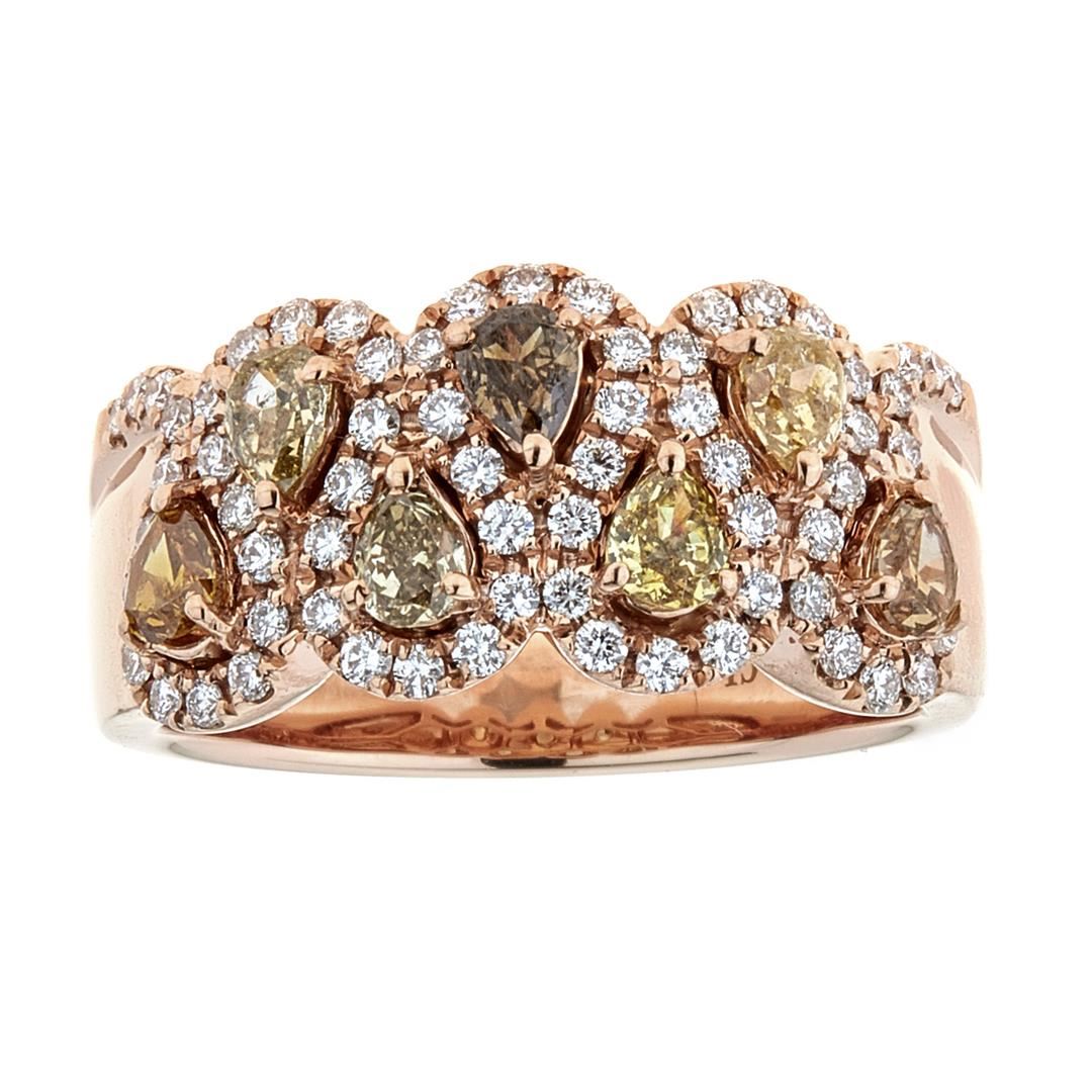 One Lady' s Yellow, Champagne, and Cognac Diamond Ring. Setting: 18 Kt. Rose Gold Mounting. Additional: 67 Round Diamonds = 0.45 Cts. TWT (G-H/SI). Official/Approximate Weight of Center: 7 = 0.95 Carat Total. Cut: Pear Brilliant. Color: Fancy Brown to Fancy Yellow. Clarity: SI-I1. Measurements: Assorted. Total Weight: 8.44 grams.