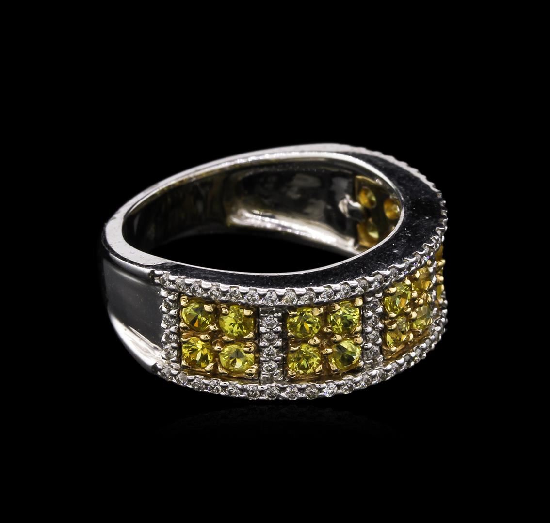 Fourteen karat (14K) two tone gold yellow sapphire and diamond ring. Twenty (20) round brilliant cut yellow sapphire corundum gemstones ae prong mounted in the center of the ring. Round brilliant cut diamonds accent the ring around the center gemstones. The ring is cast stamped "14K" and has a gross weight of 6.2 Grams. Diamond(s): Shape: Round Brilliant Cut. Weight: 0.37 carat. Average Clarity: I1. Average Color: H-J. Symmetry: Very Good. Polish: Very Good. GemStone(s): GemStone: Sapphire Corundum. Nature: Natural. Shape: Round Brilliant, Faceted. Quantity: 20, Mounted. Weight: 0.95 carat. Bulge: Visible. Clarity: SI, Type 2. Color: Yellow: (2/3). Symmetry: Very Good. Color Intensity: Medium. Transparency: Transparent. Tone: Medium. Metal(s): Metal: Gold, Stamped. Purity: 14K. Color: Two Tone. Condition: Excellent. Finish: High polish. GGA Appraised.