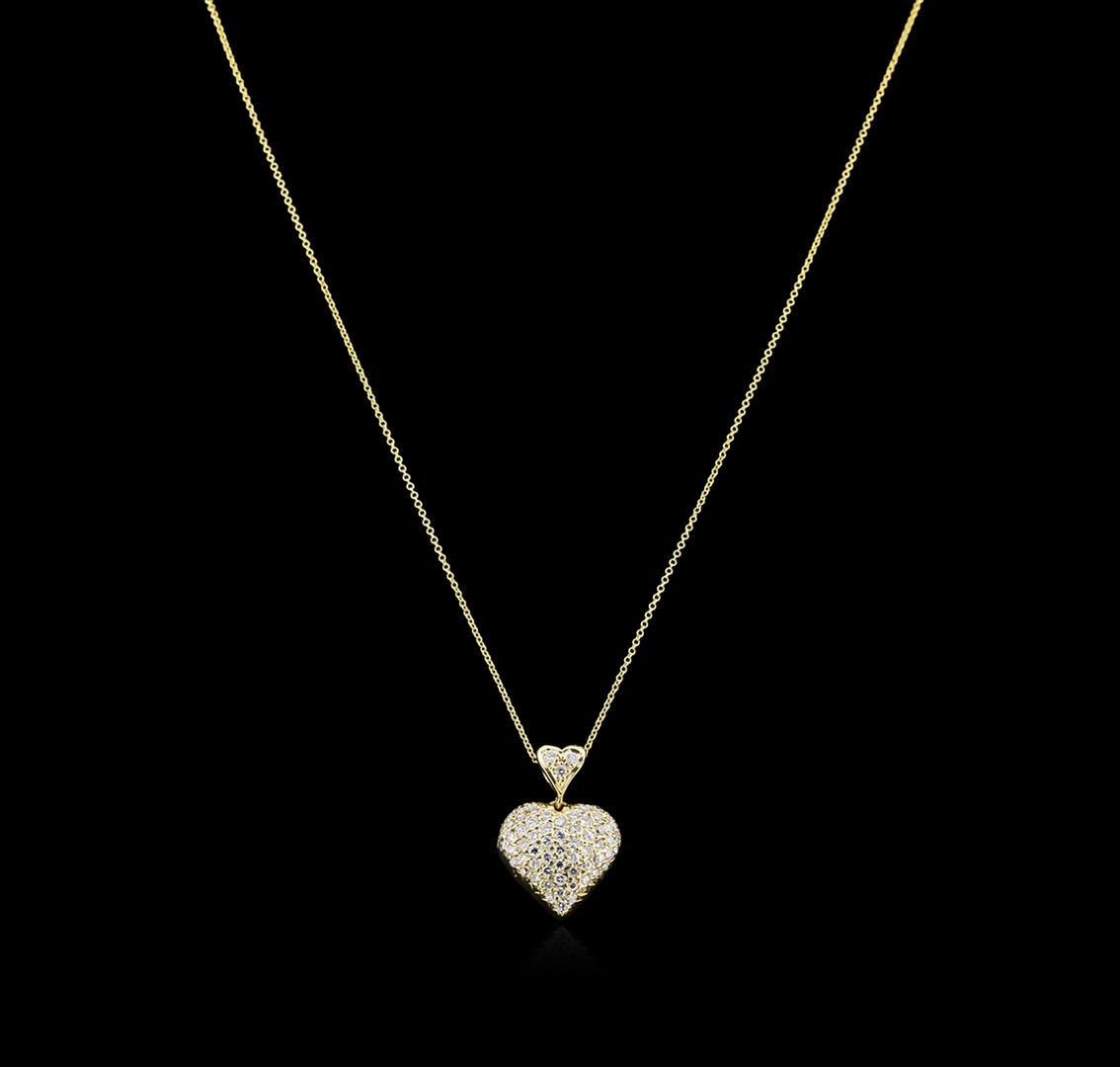 One electronically tested 14KT yellow gold ladies cast diamond heart pendant and chain 16.0" long, with a spring ring clasp with a bright polish finish. Identified with markings of "14K". Condition is new. Containing: Sixty-Four prong set round brilliant cut diamonds, measuring 1.70 - 1.50 x 0.96mm (depth est.) approximate total weight of 64 Stones = 0.95ct. Clarity: VS-2 to SI-1. Color: H - I, Cut is Good. Diamonds are graded in the mounting, unless otherwise stated. Total Weight of Diamonds 0.95ct. Total Weight of Heart Pendant And Chain 5.60gm. GGL Appraised at $2,880.00.