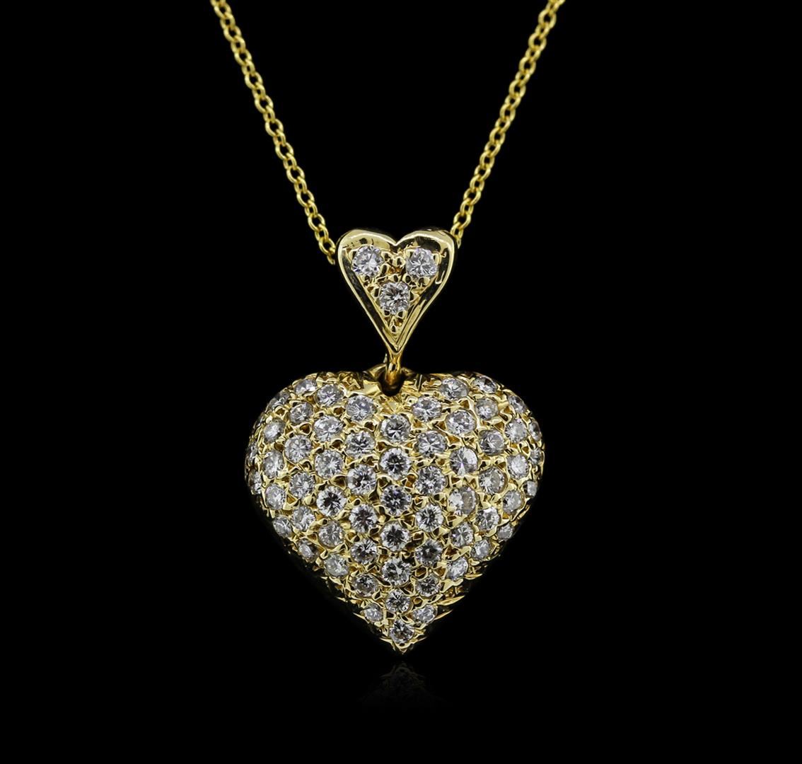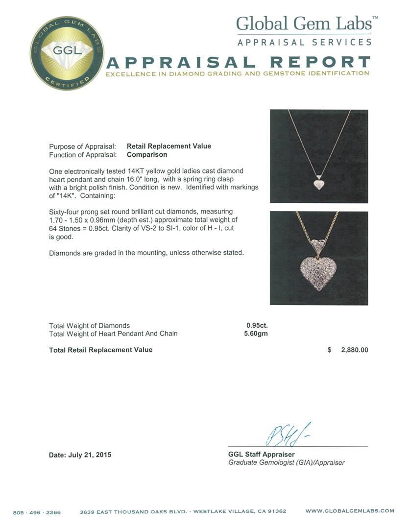 One electronically tested 14KT yellow gold ladies cast diamond heart pendant and chain 16.0" long, with a spring ring clasp with a bright polish finish. Identified with markings of "14K". Condition is new. Containing: Sixty-Four prong set round brilliant cut diamonds, measuring 1.70 - 1.50 x 0.96mm (depth est.) approximate total weight of 64 Stones = 0.95ct. Clarity: VS-2 to SI-1. Color: H - I, Cut is Good. Diamonds are graded in the mounting, unless otherwise stated. Total Weight of Diamonds 0.95ct. Total Weight of Heart Pendant And Chain 5.60gm. GGL Appraised at $2,880.00.