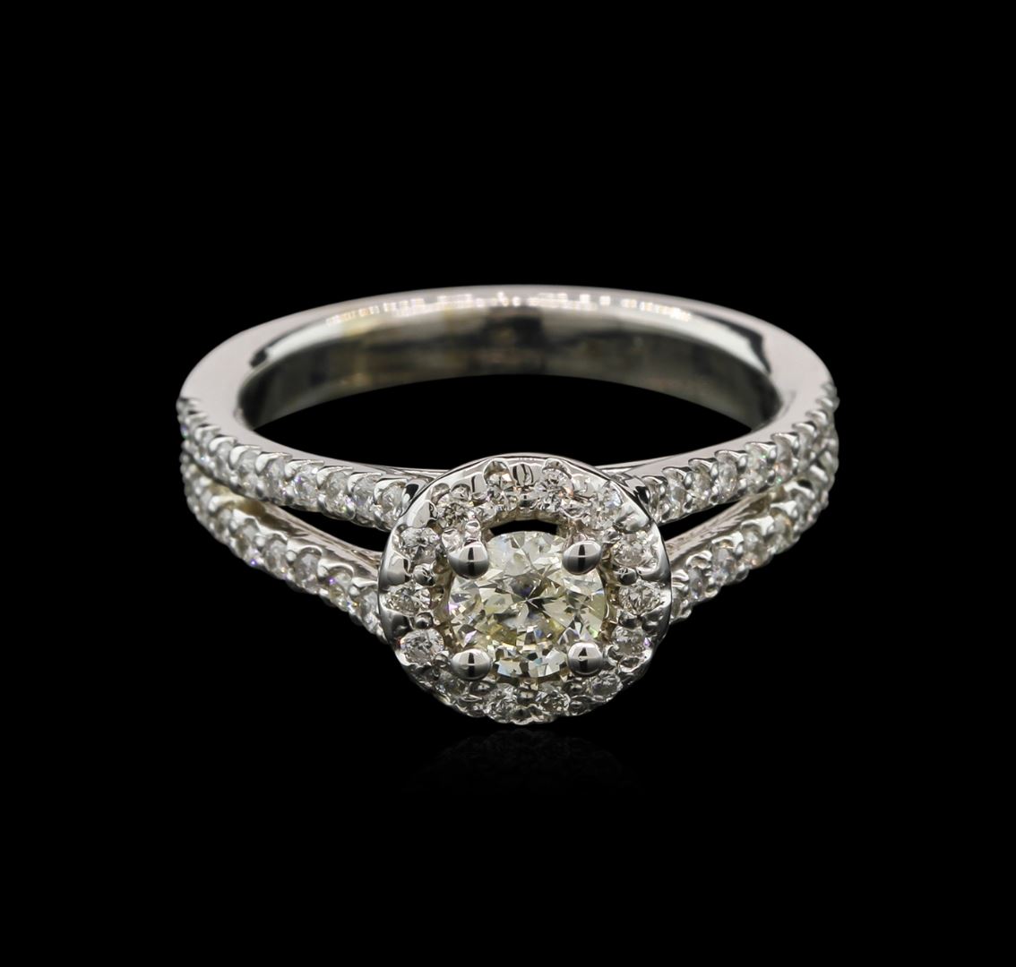 One electronically tested 14KT white gold ladies cast diamond unity ring with a bright polish finish. The featured diamond is set within a diamond set bezel supported by diamond set split shoulders, completed by a grooved three millimeter wide band. Condition is new, good workmanship. Containing: One prong set round brilliant cut diamond, measuring 4.80 - 4.70 x 2.85mm exact weight 0.44ct. Graded in the setting. Clarity: I-1. Color: J. Depth 60.0%. Table 59.0%. Fifty-Four prong set round brilliant cut diamonds exact total weight 54 Stones = 0.51ct. Graded in the setting. Clarity: SI-2 to I-1. Color: G - I. Total Weight of Diamonds 0.95ct. Total Weight of Ring 5.22gm. AIG Appraised at $4,005.00.