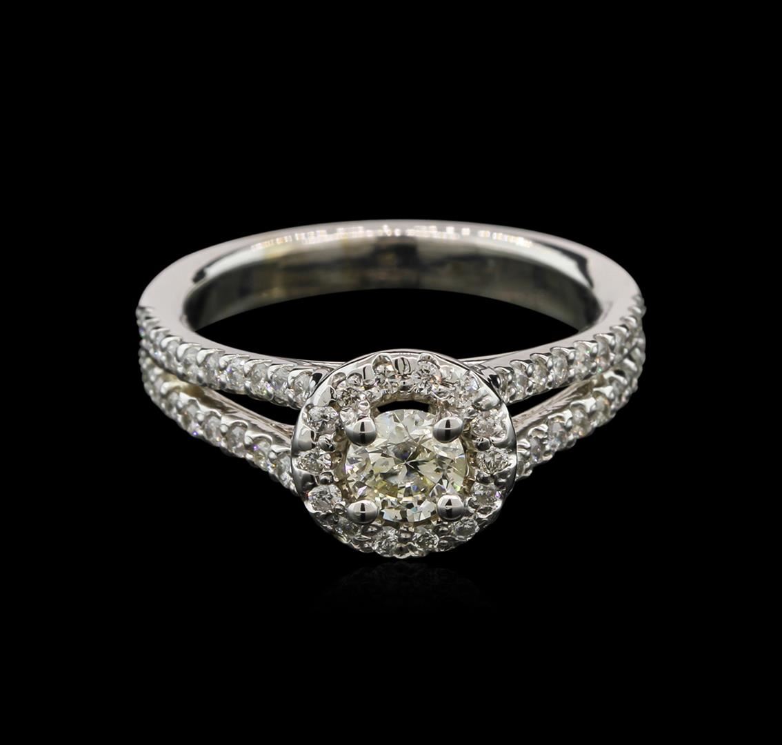 One electronically tested 14KT white gold ladies cast diamond unity ring with a bright polish finish. The featured diamond is set within a diamond set bezel supported by diamond set split shoulders, completed by a grooved three millimeter wide band. Condition is new, good workmanship. Containing: One prong set round brilliant cut diamond, measuring 4.80 - 4.70 x 2.85mm exact weight 0.44ct. Graded in the setting. Clarity: I-1. Color: J. Depth 60.0%. Table 59.0%. Fifty-Four prong set round brilliant cut diamonds exact total weight 54 Stones = 0.51ct. Graded in the setting. Clarity: SI-2 to I-1. Color: G - I. Total Weight of Diamonds 0.95ct. Total Weight of Ring 5.22gm. AIG Appraised at $4,005.00.