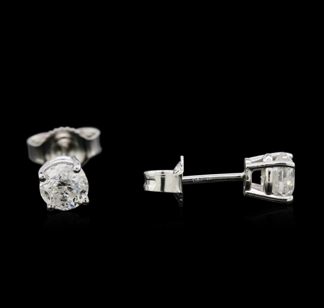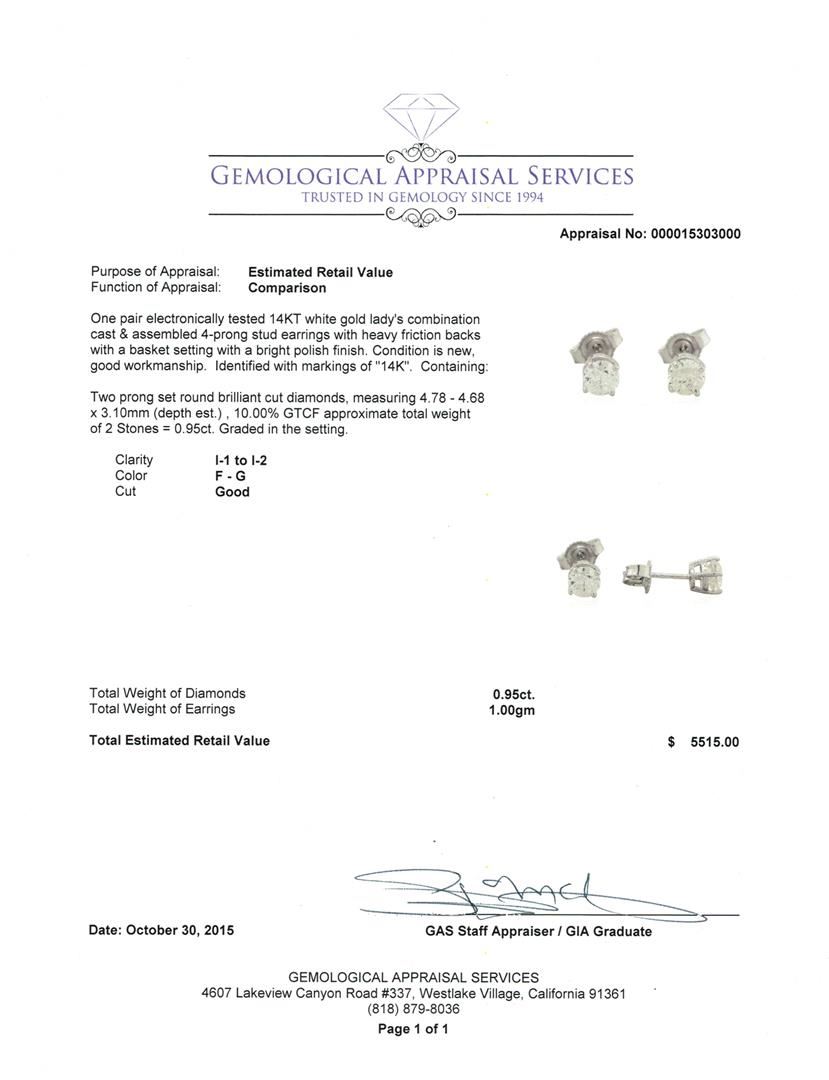 One pair electronically tested 14KT white gold lady's combination cast & assembled 4-prong stud earrings with heavy friction backs with a basket setting with a bright polish finish. Identified with markings of "14K". Condition is new, good workmanship. Containing: Two prong set round brilliant cut diamonds, measuring 4.78 - 4.68 x 3.10mm (depth est.) , 10.00% GTCF approximate total weight of 2 Stones = 0.95ct. Graded in the setting. Clarity: I-1 to I-2. Color: F - G. Cut Good. Total Weight of Diamonds 0.95ct. Total Weight of Earrings 1.00gm. GAS Appraised.
