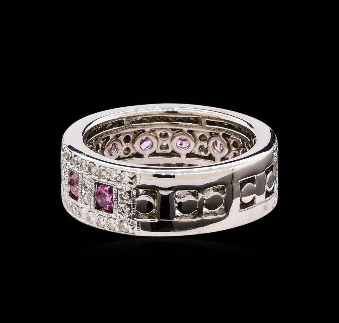 One electronically tested 18KT white gold ladies cast pink sapphire and diamond ring. The ring features a continuous six and one-half millimeter wide pink sapphire and diamond ribbon. Bright polish finish with milgrain detailing throughout. Ring size 6. Condition is good. Containing: Ten bezel set round mixed cut natural pink sapphires, measuring 2.60 - 2.60 x 1.69 mm, approximate total weight of 0.95ct., clarity is slightly included, medium, moderately strong, pink color, (GIA Pk 5/4), cut is good. Transmitting light with a minimum of distortion, transparent. Naturally occurring internal & external characteristics are present. Color grade is an average for the group. Graded in the setting. Ninety-Two bead set round brilliant cut diamonds, measuring 1.30 - 1.30 x 0.78mm (depth est.) approximate total weight of 92 Stones = 0.80ct. Graded in the setting. Clarity: VS-2 to SI-1. Color: G - I. Total Weight of Colored Stones 0.95ct. Total Weight of Diamonds 0.80ct. Total Weight of Ring 8.43gm. AIG Appraised at $4,990.00.