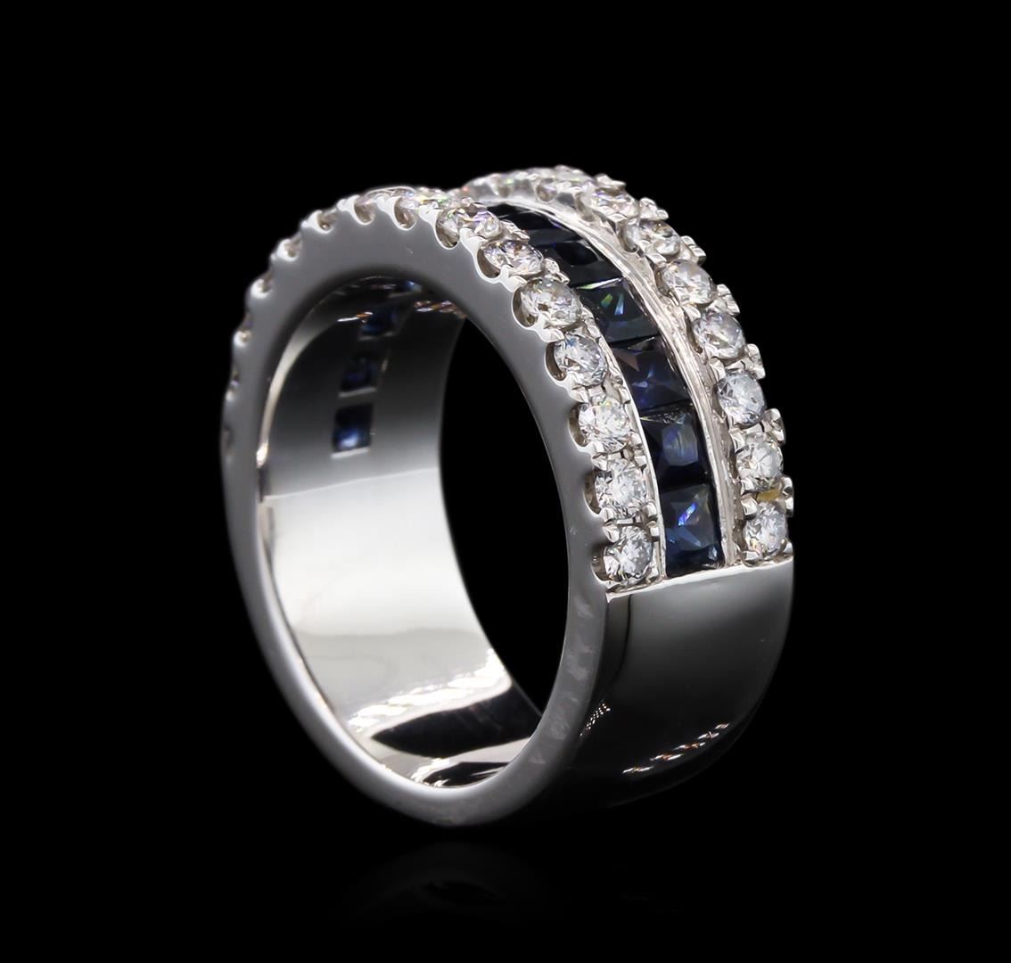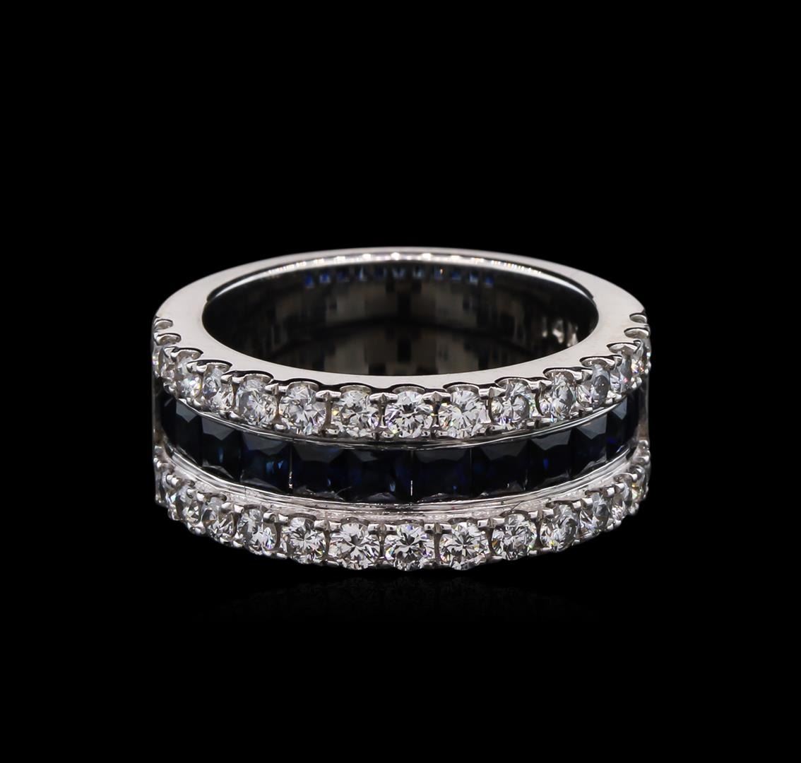 One electronically tested 14KT white gold lady's cast fashion band with a straight line with a bright polish finish. The featured lady's ring has a shank measuring 7.76 millimeters wide. Identified with markings of "14K". Condition is new, good workmanship. Containing: Twelve channel set princess modified brilliant cut natural blue sapphires, measuring 2.40 x 2.30 x 1.50mm, approximate total weight of 0.96ct., clarity is eye clean, type II, medium dark, moderately strong, blue color, (GIA B 6/4), cut is very good. Colored gemstones are presumed to have been subjected to commonly used enhancement processes. Graded in the setting. Thirty prong set round brilliant cut diamonds, measuring 2.10 - 2.00 x 1.33mm (depth est.) approximate total weight of 30 Stones = 1.04ct. Graded in the setting. Clarity: SI-1 to I-1. Color: H - I. Cut Good. Total Weight of Colored Stones 0.96ct. Total Weight of Diamonds 1.04ct. Total Weight of Band 10.00gm. GAS Appraised at $4,935.00.