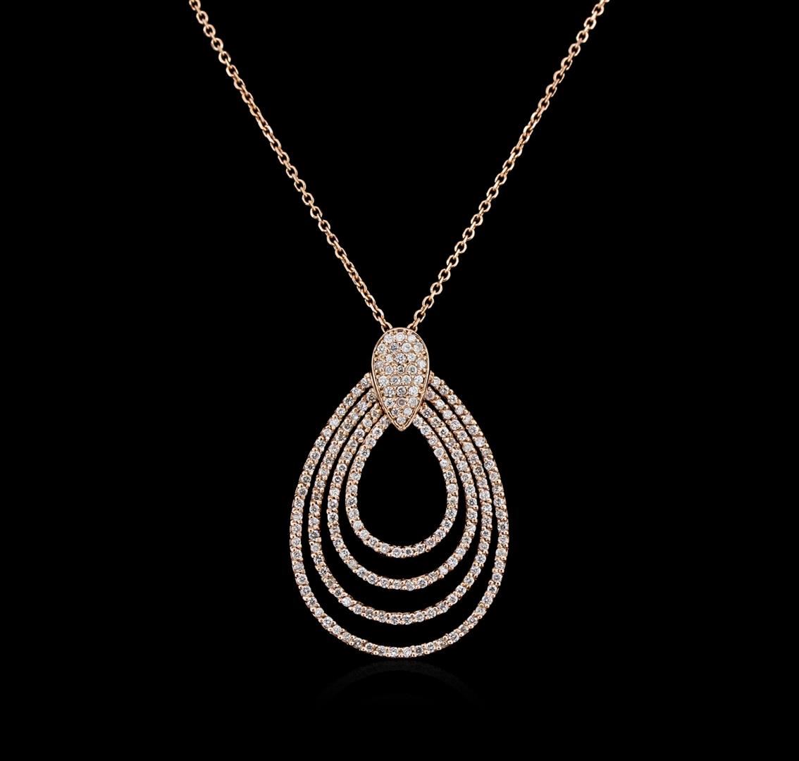 One stamped & tested 14KT rose gold lady's cast fancy pendant & chain 18.0" long, light diamond cut cable link with a spring ring clasp with a bright polish finish. Condition is new. Identified with markings of "14K". Containing: Twenty-eight bead set round brilliant cut diamonds, measuring 1.10 - 1.00 x 0.68mm (depth est.) approximate total weight of 28 Stones = 0.13ct. Clarity: SI-2 to I-1. Color: G - I. Cut: Good. One hundred sixty-six prong set round brilliant cut diamonds, measuring 1.10 - 1.00 x 0.68mm (depth est.) approximate total weight of 166 Stones = 0.83ct. Clarity: SI-2 to I-1. Color: G - I. Cut: Good. Total Weight of Diamonds: 0.96ct. Total Weight of Pendant & Chain: 6.00 gm. GAS Appraised at $4,010.00.