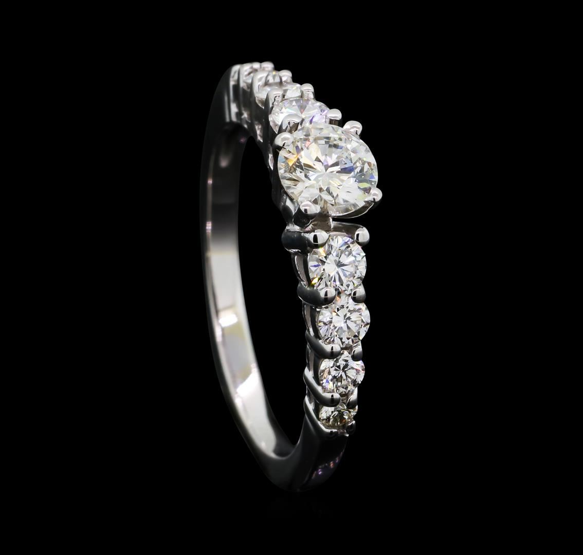 One electronically tested 14KT white gold lady's cast straight line wedding ring with a cathedral shank with a bright polish finish. The featured lady's ring has a shank measuring 1.82 millimeters wide. Identified with markings of '14K'. Condition is new, good workmanship. Containing: One prong set round brilliant cut diamond, measuring 4.98 - 4.96 x 3.03mm (depth est.) approximate weight of 0.46ct. Graded in the setting. Clarity SI-2. Color: H - I Cut Good Four prong set round brilliant cut diamonds, measuring 2.95 - 2.60 x 1.73mm (depth est.) approximate total weight of 4 Stones = 0.35ct. Graded in the setting. Clarity VS-1 to VS-2. Color: H - I Cut Very Good Four prong set round brilliant cut diamonds, measuring 2.30 - 2.00 x 1.34mm (depth est.) approximate total weight of 4 Stones = 0.15ct. Graded in the setting. Clarity VS-1 to VS-2. Color: H - I Cut Very Good. Total Weight of Diamonds 0.96ct.. Total Weight of Ring 3.40gm GAS Appraised at $4,370.00.