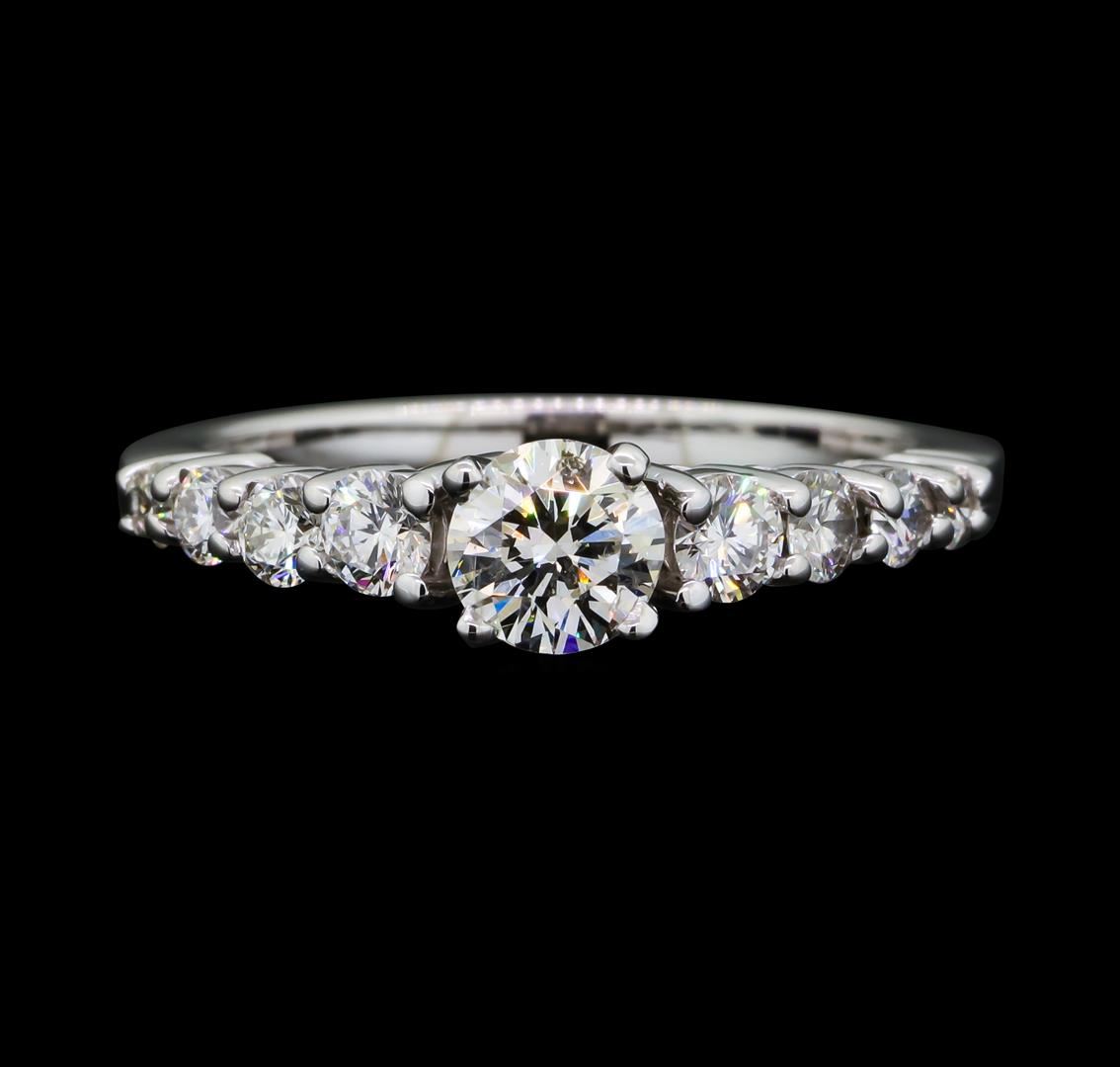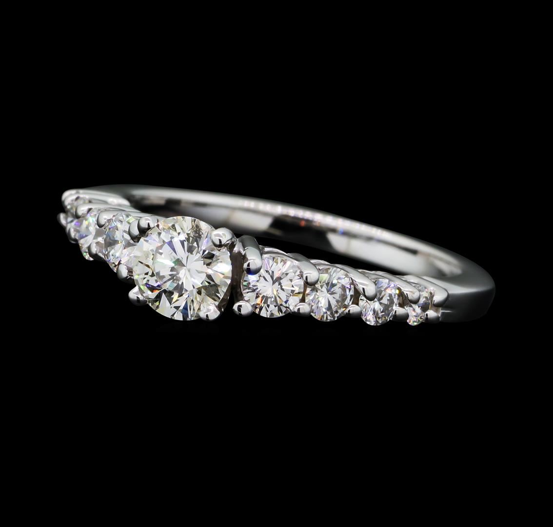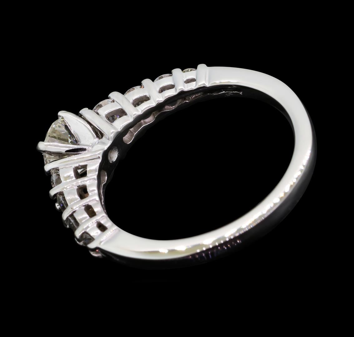 One electronically tested 14KT white gold lady's cast straight line wedding ring with a cathedral shank with a bright polish finish. The featured lady's ring has a shank measuring 1.82 millimeters wide. Identified with markings of '14K'. Condition is new, good workmanship. Containing: One prong set round brilliant cut diamond, measuring 4.98 - 4.96 x 3.03mm (depth est.) approximate weight of 0.46ct. Graded in the setting. Clarity SI-2. Color: H - I Cut Good Four prong set round brilliant cut diamonds, measuring 2.95 - 2.60 x 1.73mm (depth est.) approximate total weight of 4 Stones = 0.35ct. Graded in the setting. Clarity VS-1 to VS-2. Color: H - I Cut Very Good Four prong set round brilliant cut diamonds, measuring 2.30 - 2.00 x 1.34mm (depth est.) approximate total weight of 4 Stones = 0.15ct. Graded in the setting. Clarity VS-1 to VS-2. Color: H - I Cut Very Good. Total Weight of Diamonds 0.96ct.. Total Weight of Ring 3.40gm GAS Appraised at $4,370.00.