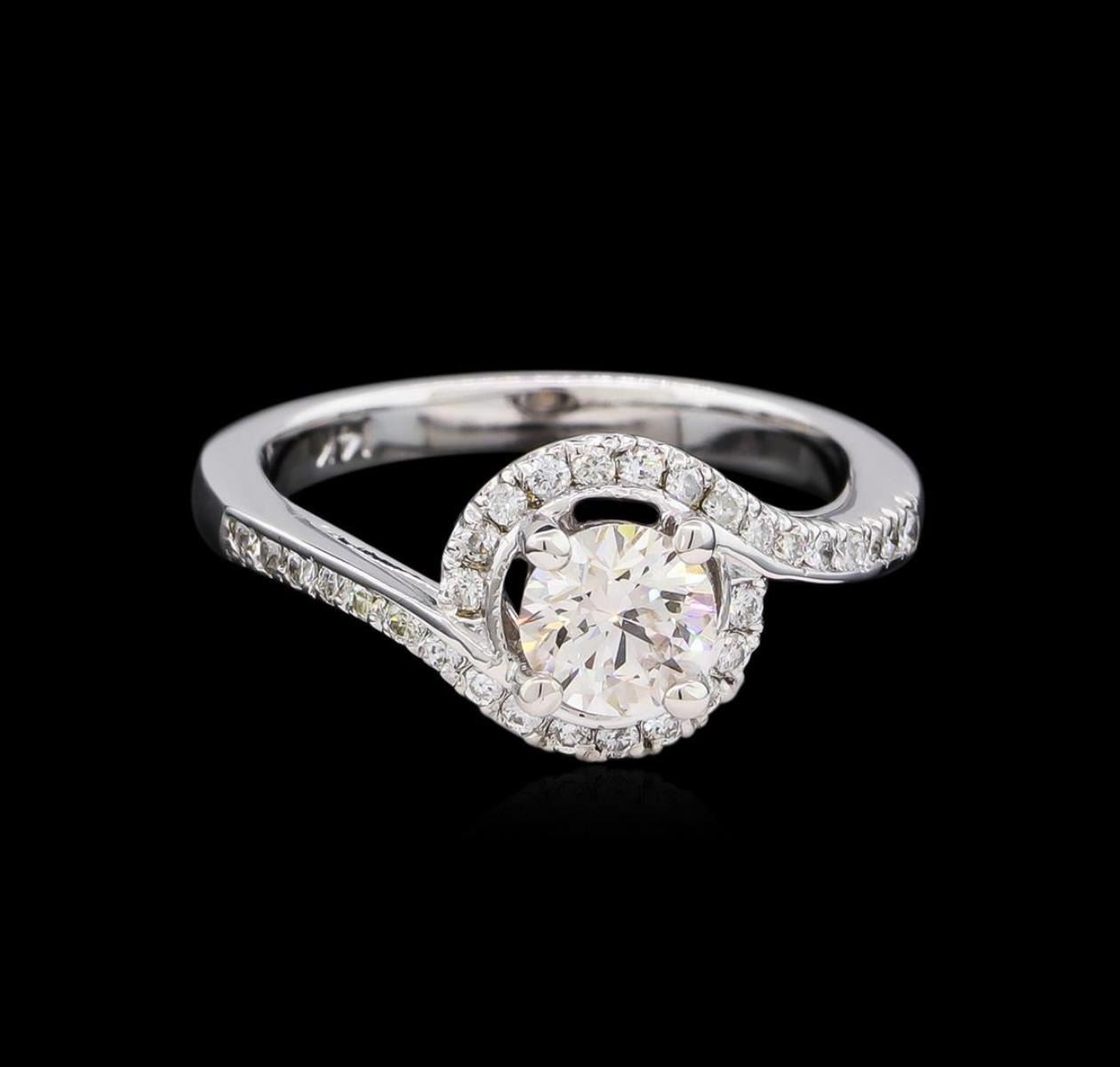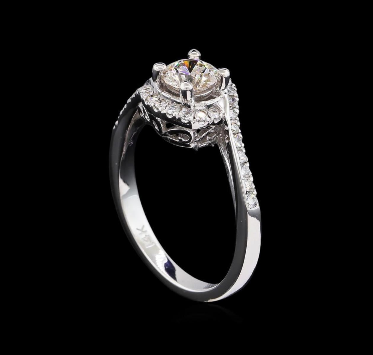 One electronically tested 14KT white gold lady's cast wedding ring with a bypass halo with a bright polish finish. The featured lady's ring has a shank measuring 2.46 millimeters wide. Identified with markings of "14K". Condition is new, good workmanship. Containing: One prong set round brilliant cut diamond, measuring 5.69 - 5.68 x 3.53mm (depth est.) approximate weight of 0.71ct. Graded in the setting. Clarity: SI-1. Color: I - Excellent Thirty prong set round brilliant cut diamonds, measuring 1.35 - 1.25 x 0.81mm (depth est.) approximate total weight of 30 Stones = 0.25ct. Graded in the setting. Clarity: SI-1 to SI-2. Color: G - Good. Total Weight of Diamonds 0.96ct. Total Weight of Ring 4.50gm GAS Appraised.