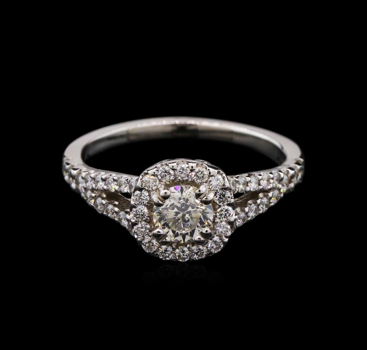 One electronically tested 14KT white gold ladies cast diamond unity ring with a bright polish finish. The ring features a round brilliant diamond set in a gallery of diamonds, supported by diamond set split shoulders and completed by a one and one half inch wide band. Identified with markings of "14K". Condition is new, good workmanship. Containing: One prong set round brilliant cut diamond, measuring 5.15 - 5.10 x 3.25mm exact weight 0.50ct with a medium blue fluorescence. Graded in the setting. Clarity: I-1. Color: J. Depth 63.4%. Table 53.6%. Forty-Two prong set round brilliant cut diamonds, measuring 1.70 - 1.30 x 0.90mm exact total weight 42 Stones = 0.46ct. Graded in the setting. Clarity: SI-2 to I-1. Color: G. Total Weight of Diamonds 0.96ct. Total Weight of Ring 3.21gm. AIG Appraised.