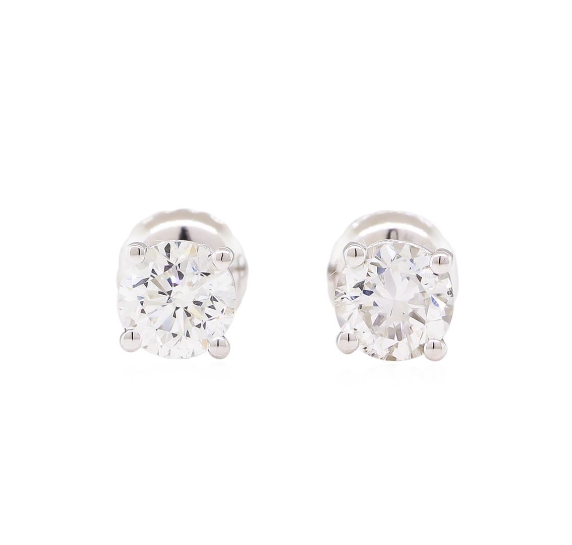 One pair electronically tested 14KT white gold lady's combination cast & assembled stud earrings with threaded posts and screw-on/screw-off backs with a bright polish finish. Identified with markings of "14K". Condition is new, good workmanship. Containing: Two prong set round brilliant cut diamonds, measuring 4.76 - 4.70 x 3.22mm (depth est.) , 5.00.%. GTCF approximate total weight of 2 Stones = 0.96ct. Graded in the setting. Clarity: SI-1 to SI-2. Color: H - I. Cut Very Good. Total Weight of Diamonds 0.96ct. Total Weight of Earrings 1.00gm. GAS Appraised at $6,150.00.