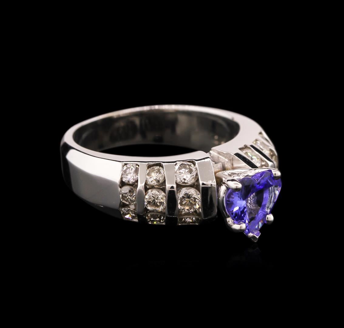 One electronically tested 14KT white gold ladies cast tanzanite and diamond ring with a bright polish finish. Identified with markings of "14K". Condition is new. Containing: One prong set heart modified brilliant cut natural tanzanite, measuring 6.30 x 6.00 x 3.90mm, approximate weight of 0.96ct., clarity is eye clean, type I, medium light, very slightly grayish, violet color, (GIA V 4/3), cut is good. Eighteen channel set round brilliant cut diamonds, measuring 2.50 - 1.90 x 1.32mm (depth est.) approximate total weight of 18 Stones = 0.70ct. Clarity: SI-1 to SI-2. Color: I - J, Cut is Good. Colored gemstones are presumed to have been subjected to commonly used enhancement processes. All diamonds and colored gemstones are graded in the mounting, unless otherwise stated. Total Weight of Colored Stones 0.96ct. Total Weight of Diamonds 0.70ct. Total Weight of Ring 8.30 grams. GGL Appraised at $2,690.00.