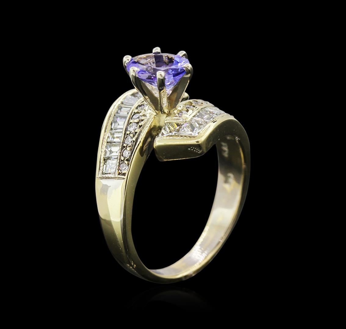 One electronically tested 14KT yellow gold ladies cast tanzanite and diamond ring. The featured tanzanite is set within a stylized diamond set by-pass design, completed by a two and one-half millimeter wide band. Bright polish finish with milgrain detailing. Identified with markings of "14K". Condition is good. Containing: One prong set oval mixed cut natural tanzanite, measuring 7.30 x 5.20 x 3.38mm, approximate weight of 0.93ct., clarity is slightly included, type I, medium dark, moderately strong, bluish violet color, (GIA bV 6/4), cut is good. Transmitting light with a minimum of distortion, transparent. Naturally occurring internal & external characteristics are present. Graded in the setting. Tanzanite is a very rare gemstone that is only found in the country of Tanzania. Originally discovered in 1967. Tiffany & Company, named the stone Tanzanite. It is found in the Usumburu Mountains that border the Umba Valley of northern Tanzania. Tanzanite occurs in gray, brown, violet, blue, reddish-purple, & green. The gem is interesting because of its exceptional pleochroism. Rotated in different directions a tanzanite will exhibit multiple changes of color. Tanzanite has a low tolerance to ultrasonic cleaning, and should not be cleaned using this method. Thirty-One prong & channel set princess, baguette and round brilliant cut diamonds approximate total weight of 31 Stones = 1.00ct. Graded in the setting. Clarity: VS-1 to SI-1. Color: H - J. Total Weight of Colored Stones 0.93ct. Total Weight of Diamonds 1.00ct. Total Weight of Ring 7.49gm. AIG Appraised at $5,920.00.