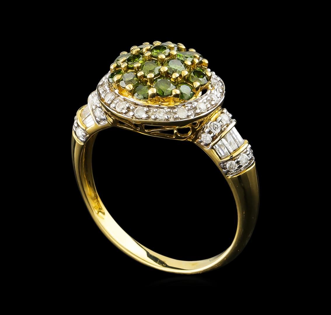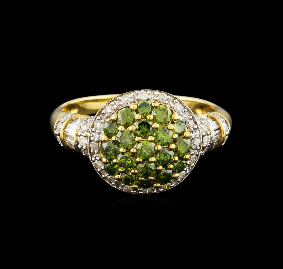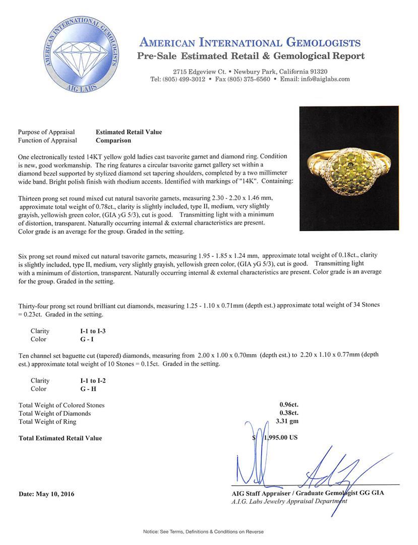 One electronically tested 14KT yellow gold ladies cast tsavorite garnet and diamond ring. The ring features a circular tsavorite garnet gallery set within a diamond bezel supported by stylized diamond set tapering shoulders, completed by a two millimeter wide band. Bright polish finish with rhodium accents. Identified with markings of "14K". Condition is new, good workmanship. Containing: Thirteen prong set round mixed cut natural tsavorite garnets, measuring 2.30 - 2.20 x 1.46 mm, approximate total weight of 0.78ct., clarity is slightly included, type II, medium, very slightly grayish, yellowish green color, (GIA yG 5/3), cut is good. Transmitting light with a minimum of distortion, transparent. Naturally occurring internal & external characteristics are present. Color grade is an average for the group. Graded in the setting. Six prong set round mixed cut natural tsavorite garnets, measuring 1.95 - 1.85 x 1.24 mm, approximate total weight of 0.18ct., clarity is slightly included, type II, medium, very slightly grayish, yellowish green color, (GIA yG 5/3), cut is good. Transmitting light with a minimum of distortion, transparent. Naturally occurring internal & external characteristics are present. Color grade is an average for the group. Graded in the setting. Thirty-Four prong set round brilliant cut diamonds, measuring 1.25 - 1.10 x 0.71mm (depth est.) approximate total weight of 34 Stones = 0.23ct. Graded in the setting. Clarity: I-1 to I-3. Color: G - I Ten channel set baguette cut (tapered) diamonds, measuring from 2.00 x 1.00 x 0.70mm (depth est.) to 2.20 x 1.10 x 0.77mm (depth est.) approximate total weight of 10 Stones = 0.15ct. Graded in the setting. Clarity: I-1 to I-2. Color: G - H. Total Weight of Colored Stones 0.96ct. Total Weight of Diamonds 0.38ct. Total Weight of Ring 3.31gm. AIG Appraised at $1,995.00.