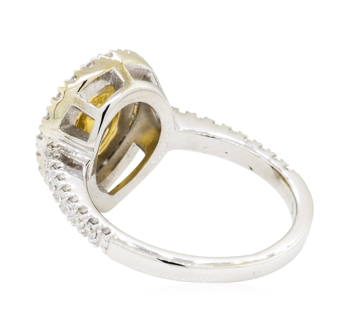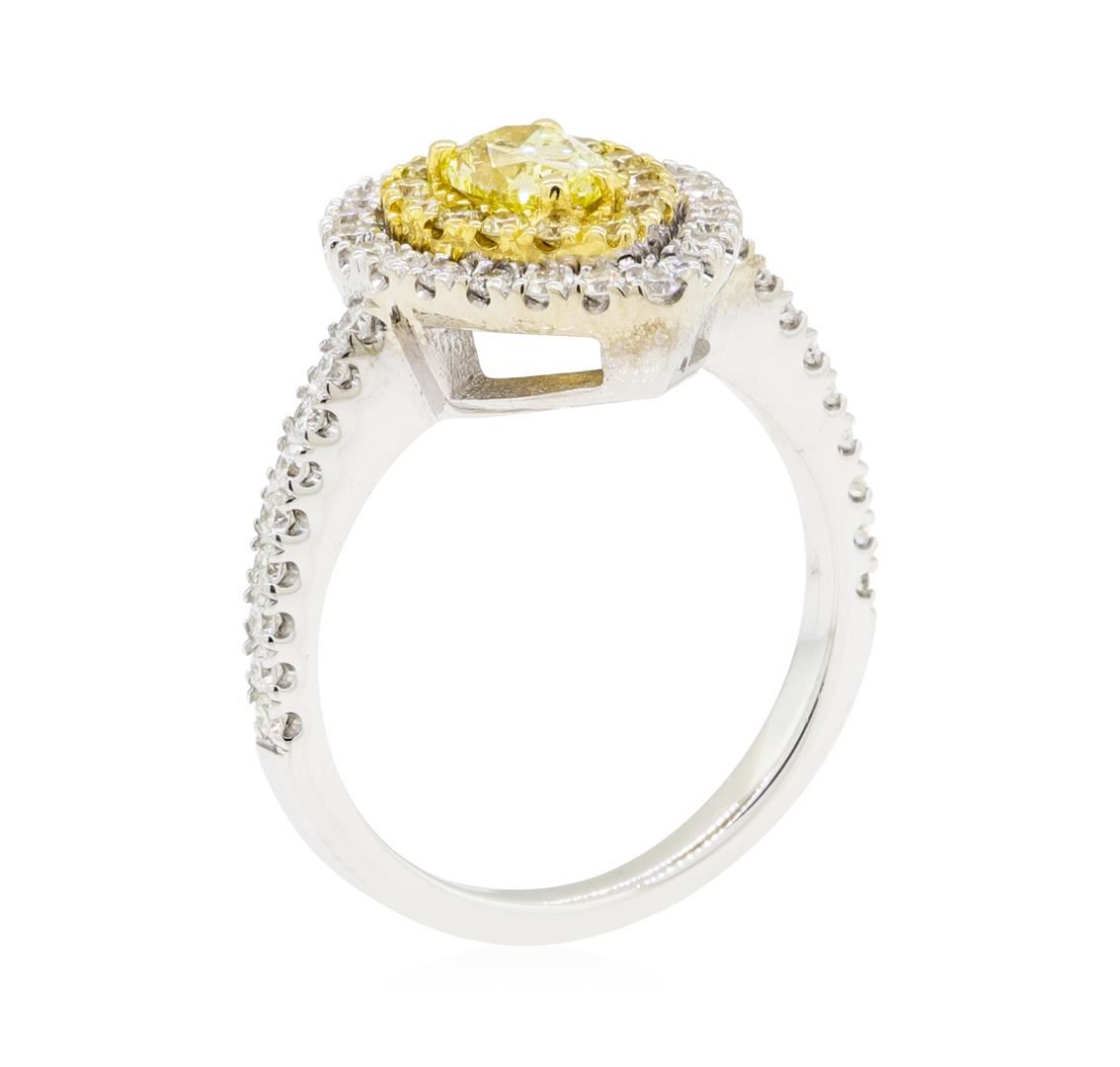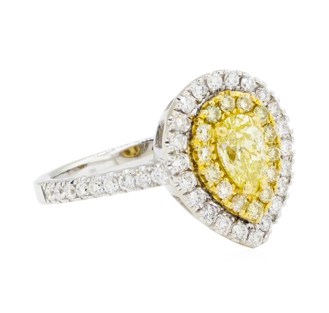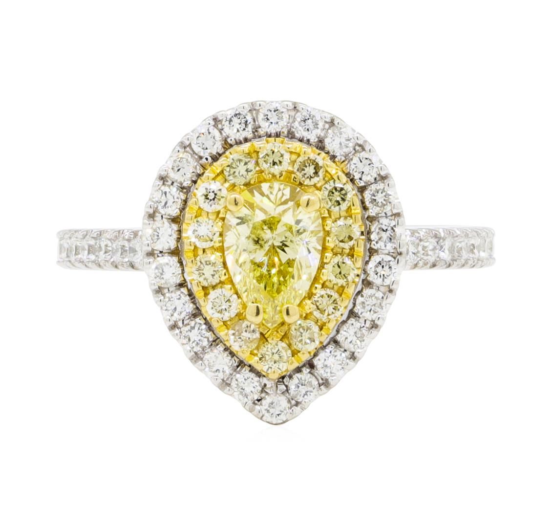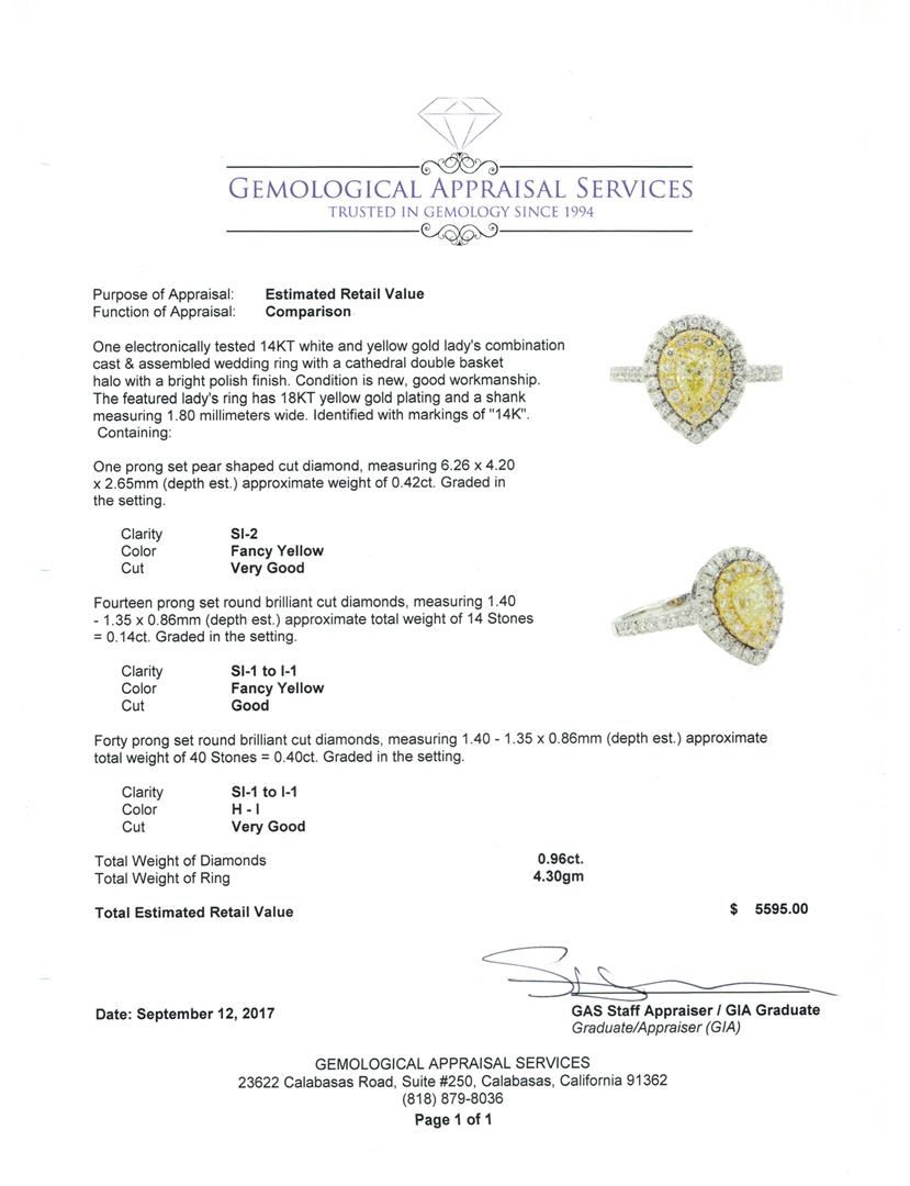 One electronically tested 14KT white and yellow gold lady's combination cast & assembled wedding ring with a cathedral double basket halo with a bright polish finish. The featured lady's ring has 18KT yellow gold plating and a shank measuring 1.80 millimeters wide. Identified with markings of '14K'. Condition is new, good workmanship. Containing: One prong set pear shaped cut diamond, measuring 6.26 x 4.20 x 2.65mm (depth est.) approximate weight of 0.42ct. Graded in the setting. Color Fancy Yellow Clarity SI-2 Cut Very Good Fourteen prong set round brilliant cut diamonds, measuring 1.40 - 1.35 x 0.86mm (depth est.) approximate total weight of 14 Stones = 0.14ct. Graded in the setting. Color Fancy Yellow Clarity SI-1 to I-1 Cut Good Forty prong set round brilliant cut diamonds, measuring 1.40 - 1.35 x 0.86mm (depth est.) approximate total weight of 40 Stones = 0.40ct. Graded in the setting. Color H - I Clarity SI-1 to I-1 Cut Very Good. Total Weight of Diamonds 0.96ct.. Total Weight of Ring 4.30gm GAS Appraised at $5595.00. GAS Appraised at $5,595.00.