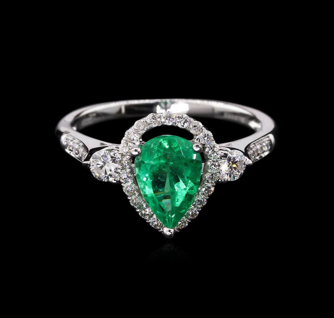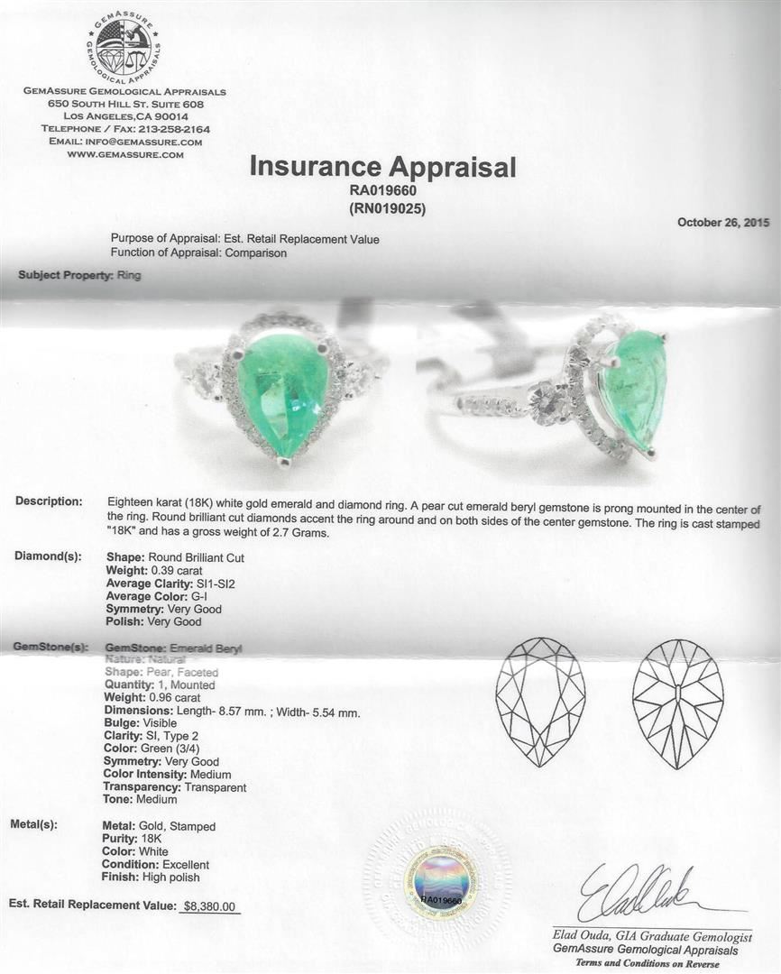 Eighteen karat (18K) white gold emerald and diamond ring. A pear cut emerald beryl gemstone is prong mounted in the center of the ring. Round brilliant cut diamonds accent the ring around and on both sides of the center gemstone. The ring is cast stamped GGA Appraised.