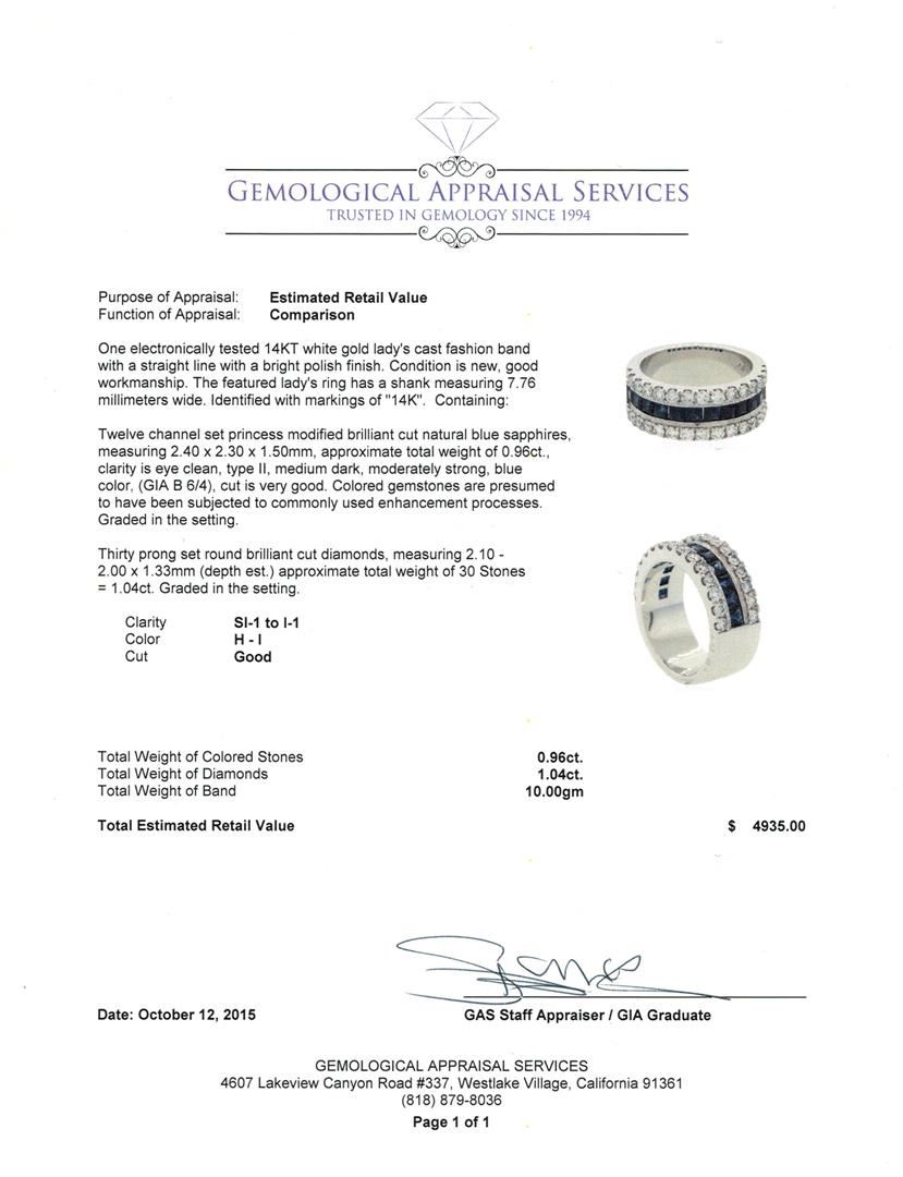One electronically tested 14KT white gold lady's cast fashion band with a straight line with a bright polish finish. The featured lady's ring has a shank measuring 7.76 millimeters wide. Identified with markings of "14K". Condition is new, good workmanship. Containing: Twelve channel set princess modified brilliant cut natural blue sapphires, measuring 2.40 x 2.30 x 1.50mm, approximate total weight of 0.96ct., clarity is eye clean, type II, medium dark, moderately strong, blue color, (GIA B 6/4), cut is very good. Colored gemstones are presumed to have been subjected to commonly used enhancement processes. Graded in the setting. Thirty prong set round brilliant cut diamonds, measuring 2.10 - 2.00 x 1.33mm (depth est.) approximate total weight of 30 Stones = 1.04ct. Graded in the setting. Clarity: SI-1 to I-1. Color: H - I. Cut Good. Total Weight of Colored Stones 0.96ct. Total Weight of Diamonds 1.04ct. Total Weight of Band 10.00gm. GAS Appraised at $4,935.00.