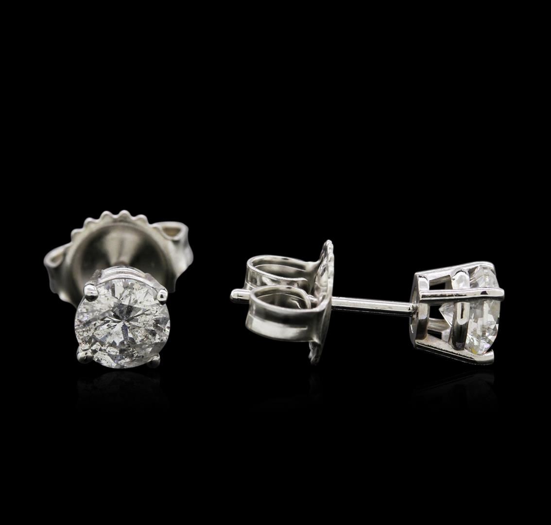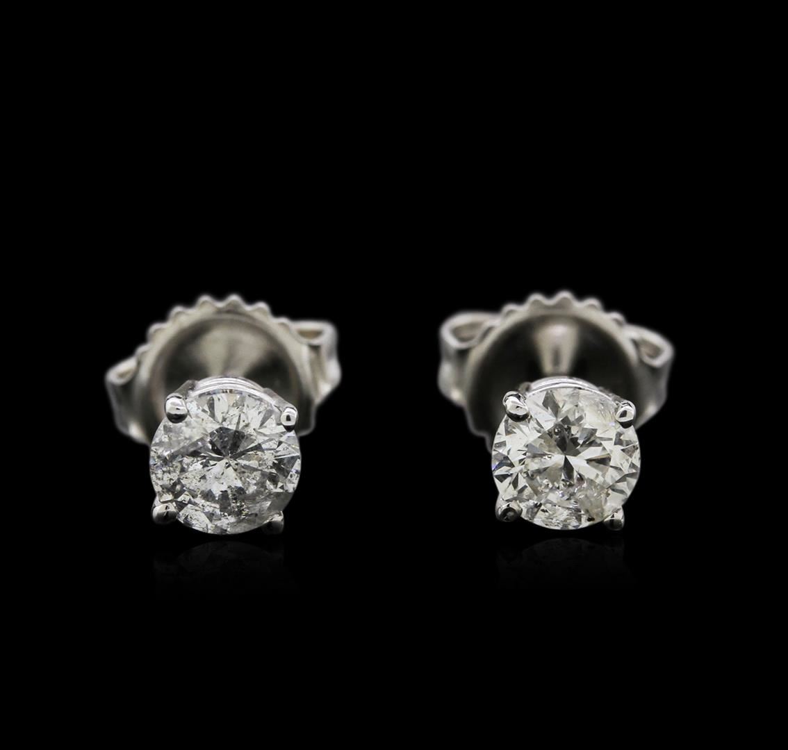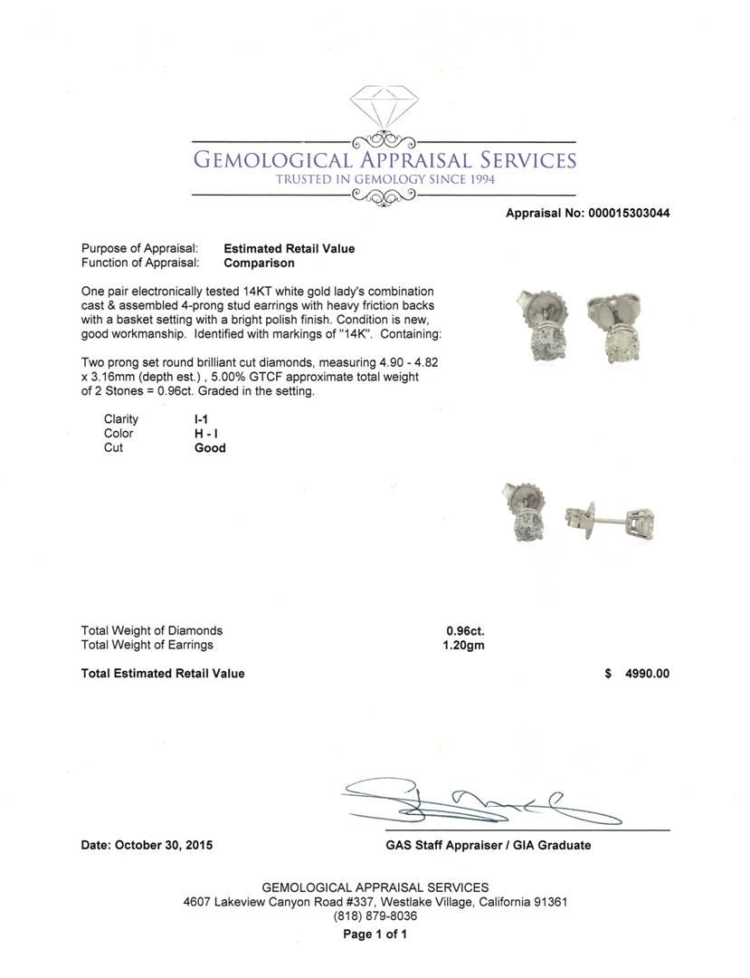 One pair electronically tested 14KT white gold lady's combination cast & assembled 4-prong stud earrings with heavy friction backs with a basket setting with a bright polish finish. Identified with markings of "14K". Condition is new, good workmanship. Containing: Two prong set round brilliant cut diamonds, measuring 4.90 - 4.82 x 3.16mm (depth est.) , 5.00% GTCF approximate total weight of 2 Stones = 0.96ct. Graded in the setting. Clarity: I-1. Color: H - I. Cut Good. Total Weight of Diamonds 0.96ct. Total Weight of Earrings 1.20gm. GAS Appraised.
