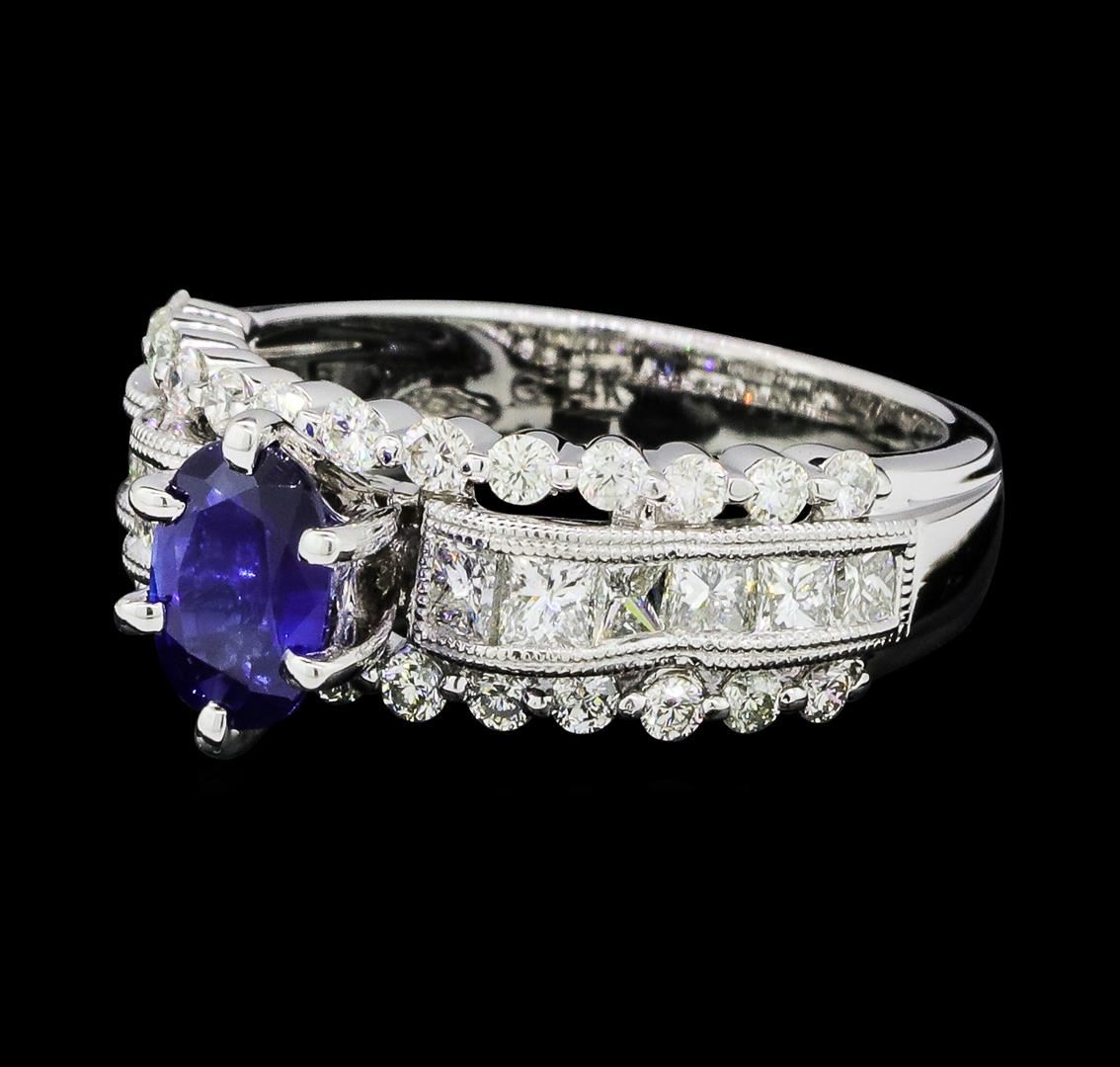One electronically tested 14KT white gold lady's cast fashion ring with a scalloped cathedral shank with a bright polish with milgrain detailing finish. The featured lady's ring has a shank measuring 3.58 millimeters wide. Identified with markings of '14K'. Condition is new, good workmanship. Containing: One prong set oval modified mixed cut natural blue sapphire, measuring 6.95 x 5.02 x 3.26mm, (depth est.) approximate weight of 0.97ct., clarity is moderately included, medium dark, very slightly grayish, blue color, (GIA B 6/3), cut is good. Transmitting light somewhat diffusely, transparent to translucent. Colored gemstones are presumed to have been subjected to commonly used enhancement processes. Graded in the setting. Twelve channel set princess cut diamonds, measuring 2.40 x 2.10 x 1.58mm (depth est.) approximate total weight of 12 Stones = 0.78ct. Graded in the setting. Color H - I Clarity SI-1 to SI-2 Cut Very Good Twenty-Six prong set round brilliant cut diamonds, measuring 1.80 - 1.70 x 1.09mm (depth est.) approximate total weight of 26 Stones = 0.52ct. Graded in the setting. Color G - H Clarity VS-2 to SI-1 Cut Very Good. Total Weight of Colored Stones 0.97ct.. Total Weight of Diamonds 1.30ct.. Total Weight of Ring 5.70gm GAS Appraised at $5090.00. GAS Appraised at $5,090.00.
